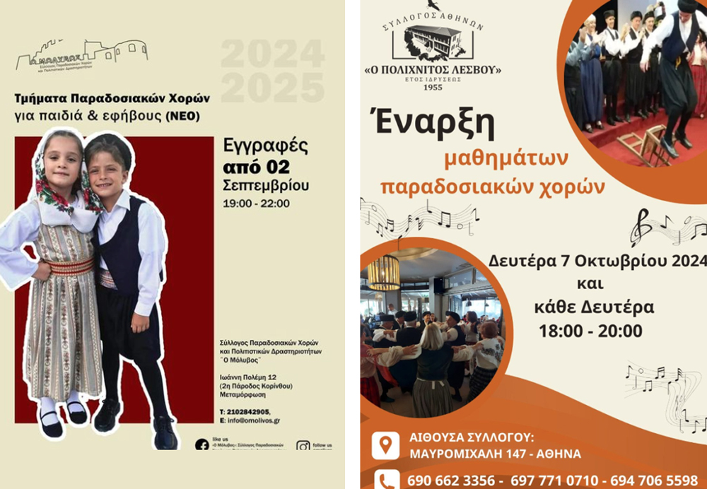 Για φέτος η έναρξη των μαθημάτων παραδοσιακών χορών στην αίθουσα του Συλλόγου Πολιχνιατών Αθήνας (Μαυρομιχάλη 147, στην Αθήνα), έχει οριστεί τη Δευτέρα 7 Οκτωβρίου και για κάθε Δευτέρα, 18:00 – 20:00.