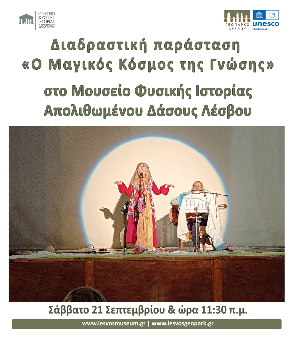 Τη Μουσείο Φυσικής Ιστορίας Απολιθωμένου Δάσους Λέσβου καλεί όλους τους μικρούς του φίλους να συμμετάσχουν στη διαδραστική παράσταση, συνοδεία ζωντανής μουσικής, με θέμα ”Ο Μαγικός Κόσμος της Γνώσης”. Η παράσταση θα πραγματοποιηθεί το Σάββατο 21 Σεπτεμβρίου στις 11:30 π.μ. στις εγκαταστάσεις του Μουσείου στο Σίγρι.