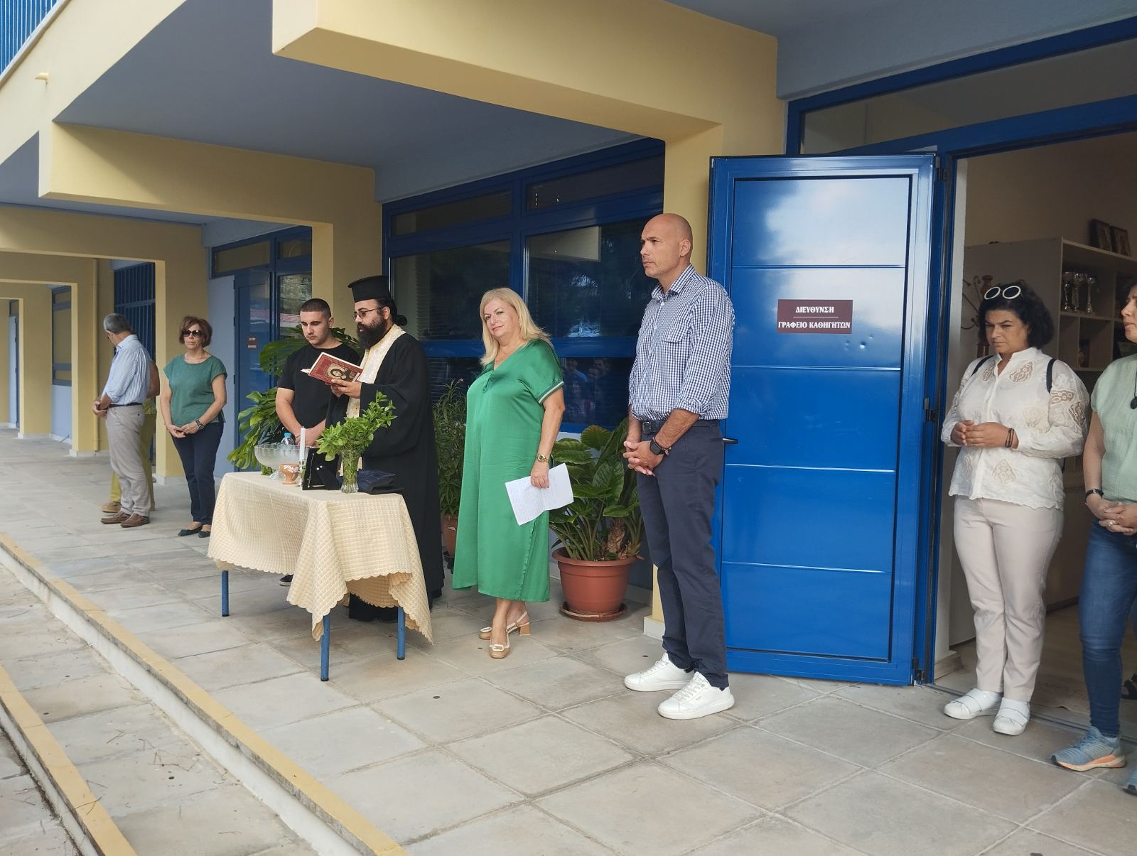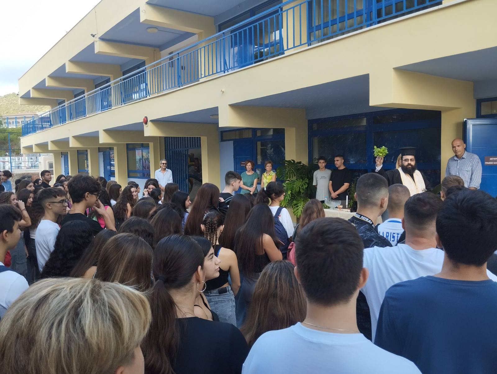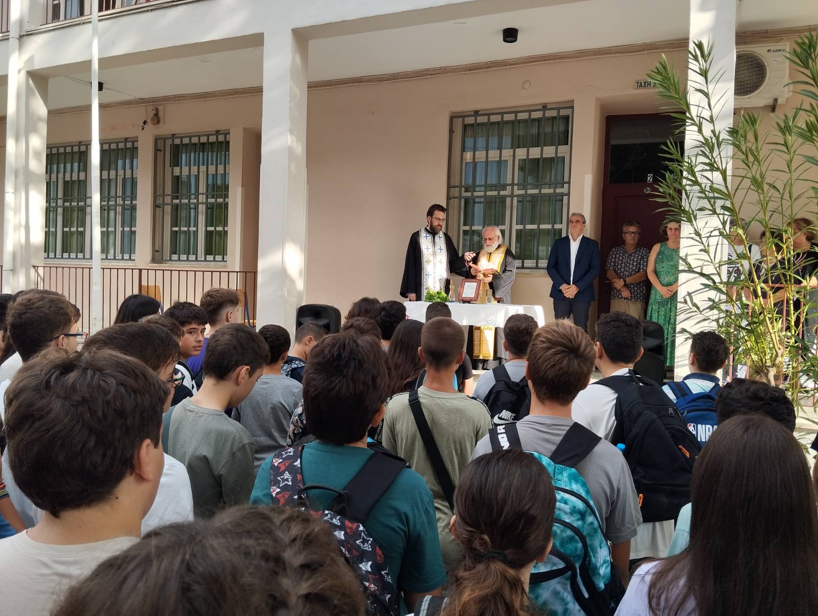 Με τον καθιερωμένο αγιασμό ξεκινά σήμερα η νέα χρονιά στα σχολεία της Πρωτοβάθμιας και Δευτεροβάθμιας Εκπαίδευσης. Το πρώτο κουδούνι στο Πρότυπο Γυμνάσιο Μυτιλήνης χτύπησε λίγο πριν τις 9 το πρωί και εκεί βρέθηκε ο Δήμαρχος Μυτιλήνης, Παναγιώτης Χριστόφας, ο οποίος ευχήθηκε καλή χρονιά με υγεία και πρόοδο στους μαθητές, τους εκπαιδευτικούς και τους γονείς, ενώ δεσμεύτηκε ότι ο Δήμος θα βρίσκεται δίπλα στην Εκπαίδευση στηρίζοντας το έργο της. Ευχές για καλή, ηλιόλουστη και ήρεμη χρόνια απηύθυνε και ο π. Αθανάσιος Γιουσμας, «μακριά από αστραπές και βροντές, σαν το χθεσινό βράδυ», όπως χαρακτηριστικά είπε.