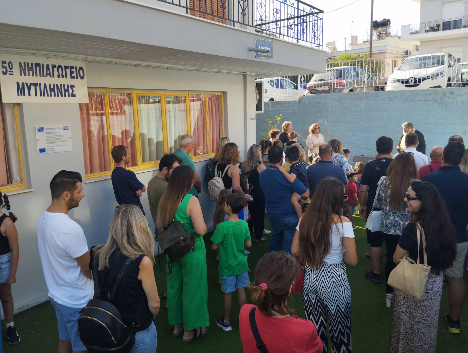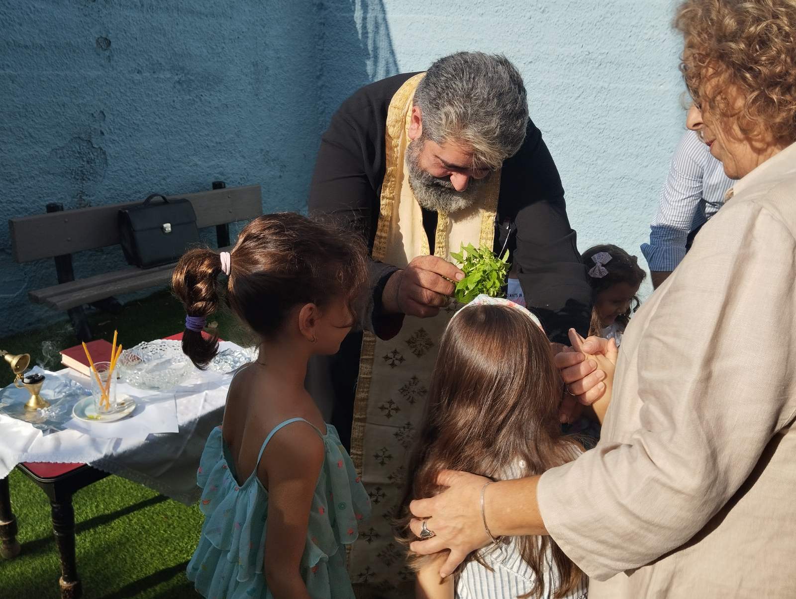 Αγιασμός και στα Νηπιαγωγεία όπου πολλά παιδιά αποχωρίζονται για πρώτη φορά τους γονείς τους. Στο 5ο Νηπιαγωγείο Μυτιλήνης ο ιερέας ευλόγησε τα νήπια με τον σταυρό και τον αγιασμό και ευχήθηκε καλή σχολική περίοδο με υγεία και χαρά.