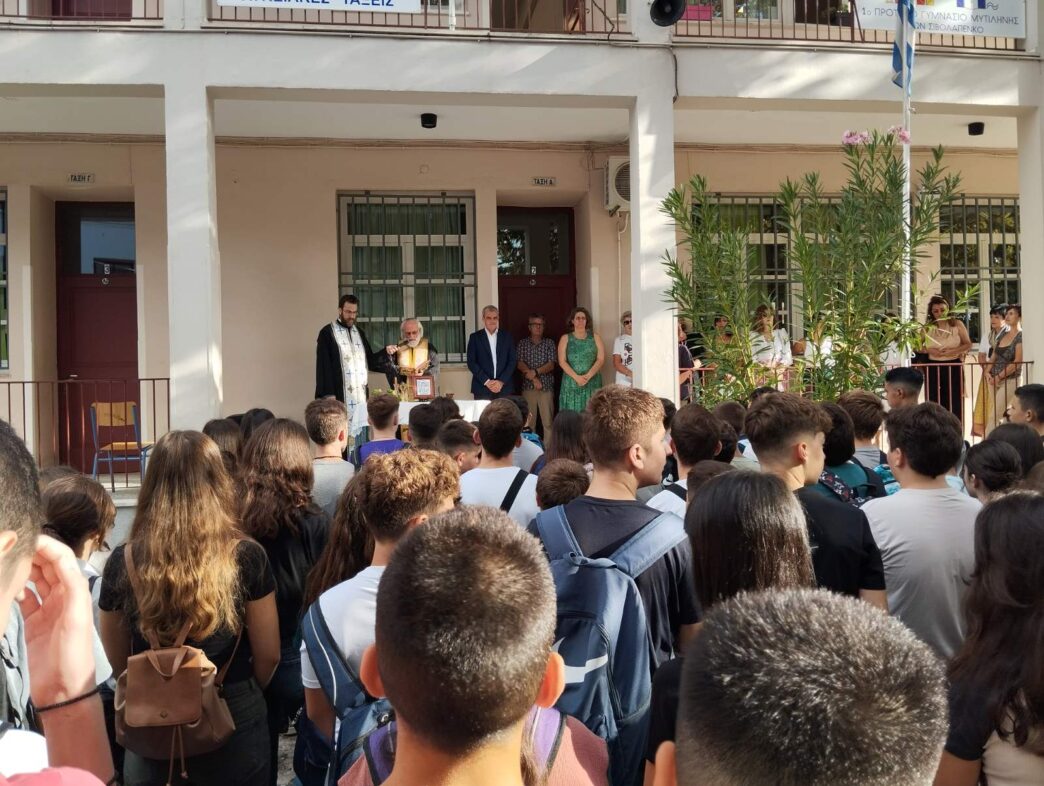 Με τον καθιερωμένο αγιασμό ξεκινά σήμερα η νέα χρονιά στα σχολεία της Πρωτοβάθμιας και Δευτεροβάθμιας Εκπαίδευσης. Το πρώτο κουδούνι στο Πρότυπο Γυμνάσιο Μυτιλήνης χτύπησε λίγο πριν τις 9 το πρωί και εκεί βρέθηκε ο Δήμαρχος Μυτιλήνης, Παναγιώτης Χριστόφας, ο οποίος ευχήθηκε καλή χρονιά με υγεία και πρόοδο στους μαθητές, τους εκπαιδευτικούς και τους γονείς, ενώ δεσμεύτηκε ότι ο Δήμος θα βρίσκεται δίπλα στην Εκπαίδευση στηρίζοντας το έργο της. Ευχές για καλή, ηλιόλουστη και ήρεμη χρόνια απηύθυνε και ο π. Αθανάσιος Γιουσμας, «μακριά από αστραπές και βροντές, σαν το χθεσινό βράδυ», όπως χαρακτηριστικά είπε.