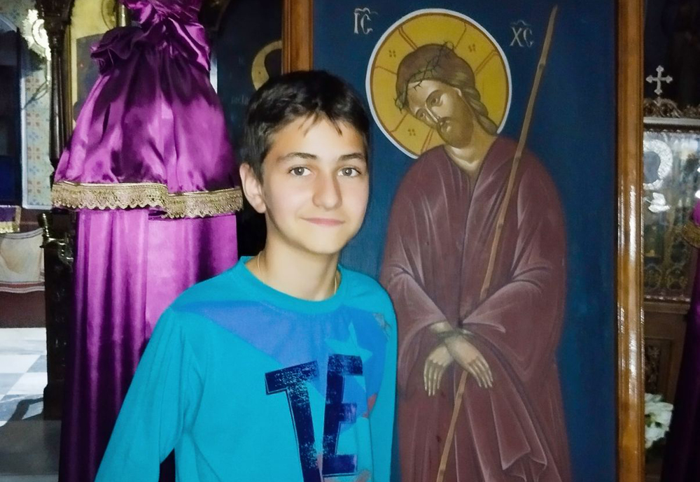 Με τα άλλα παιδιά της ηλικίας του δεν φαίνεται εξωτερικά να διαφέρει. Μοντέρνος, καθαρός με καλοσιδερωμένα και φροντισμένα ρούχα, από τη νεαρή μαμά, που τόσο τον λατρεύει. Αλλά αν σε κοιτάξει, το βλέμμα του δεν το ξεχνάς. Βαθύ, στοχαστικό, μέσα από δυο τεράστια γαλαζοπράσινα μάτια, που όταν τα αντικρίσεις σε πάνε σε άλλους τόπους. Κι είναι, όπως λένε όσοι τον ζουν, τα μάτια μιας θεόσταλτης ψυχής που ευλογήθηκε από τη μέρα που ήρθε στον κόσμο να ζει για να δοξολογεί τον Θεό, να ζωγραφίζει εικόνες, και πρωτίστως, να κουβαλάει και να εκφράζει καθάρια, με σαφήνεια την έννοια της σύγχρονης πίστης. “Δεν είμαι φανατικός”, μας λέει με μία παιδική σοφία που αφοπλίζει. “Πιστεύω στην εκκλησία, την αγαπώ, αλλά δεν είμαι θρησκόληπτος.”