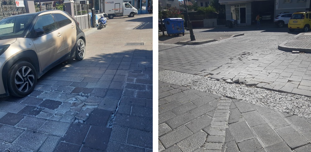 Τι είχες Γιάννη, τι είχα πάντα! Τα ξεχαρβαλωμένα πλακόστρωτα στην περιοχή του ΙΚΑ, στην Επάνω Σκάλα, όσο περνούν τα αυτοκίνητα από τους πεζόδρομους.