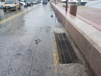 Μπορεί να ολοκληρώθηκε το έργο της ανάπλασης της Προκυμαίας από την πλευρά της θάλασσας, ωστόσο τα φρεάτια που υπάρχουν έξω από το τοιχίο δεν λειτουργούν, καθώς οι κλίσεις του δρόμου είναι τέτοιες και αντίθετες για να διευκολύνουν τη ροή προς τις σχάρες.