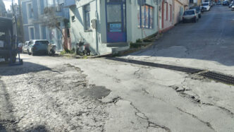 Αυτή είναι η εικόνα του δρόμου στη συμβολή των οδών Γεωργίου Βοστάνη και Κερκύρας, λίγα μέτρα από το κτίριο της παλιάς αστυνομίας. Πρόκειται για δρόμο-πραγματική παγίδα για τα διερχόμενα δίκυκλα. Ειδικά απ’ το αυλάκι, σε ένα σημείο, υπάρχει κίνδυνος ανατροπής αν ο οδηγός δεν προλάβει να το αποφύγει.
