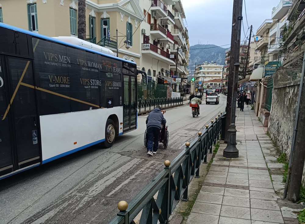 Ε, λοιπόν, γι’ αυτόν τον άνθρωπο που σπρώχνει το αναπηρικό αμαξίδιο η καθημερινή κίνηση στους δρόμους της Μυτιλήνης είναι σκέτος γολγοθάς, καθώς βλέπει πεζοδρόμια με διαβάσεις χωρίς να υπάρχουν ράμπες ή και σε άλλα πεζοδρόμια δυσκολεύεται να κινηθεί κάποιος με αναπηρικό αμαξίδιο και έτσι αναγκάζεται να κατεβαίνει στο δρόμο δίπλα στα αυτοκίνητα…