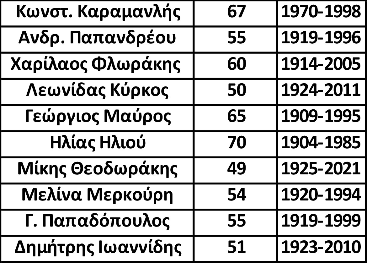 Πόσο χρονών ήταν τότε οι πρωταγωνιστές; Ο Πίνακας καταγράφει την ηλικία μερικών από αυτών το 1974 με το έτος γέννησης και θανάτου.