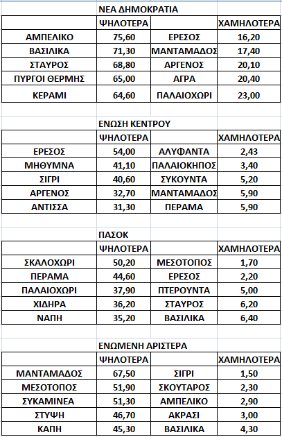 Δεν χρειάζεται ιδιαίτερη πολιτική γνώση για να καταλάβεις ότι το μεγαλύτερο ποσοστό της Ενωμένης Αριστεράς στη Λέσβο καταγράφηκε στον Μανταμάδο! Όμως στον Πίνακα αποτυπώνονται τα υψηλότερα και χαμηλότερα ποσοστά των κομμάτων, που παρά το «δημοψηφιστικό» χαρακτήρα των εκλογών, αποτυπώνει πολιτικές προτιμήσεις (ή μη).
