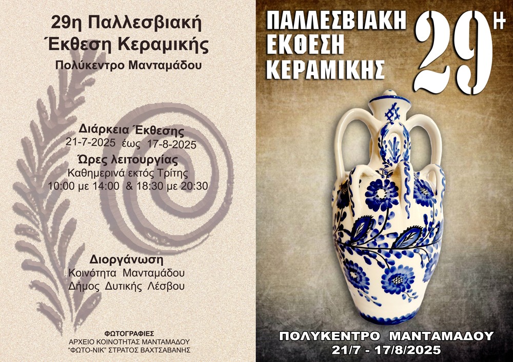 Η Κοινότητα Μανταμάδου σε συνεργασία με το Δήμο Δυτικής Λέσβου διοργανώνει την 29η Π.Ε.Κ, στην οποία θα συμμετάσχουν περίπου 55 Κεραμίστες από τη Λέσβο, την Κρήτη, την Αθήνα, την Θεσσαλονίκη, την Τρίπολη, την Πάτρα, την Χίο, την Σάμο καθώς κι από χώρες του εξωτερικού, όπως την Γαλλία, το Βέλγιο και την Αγγλία.