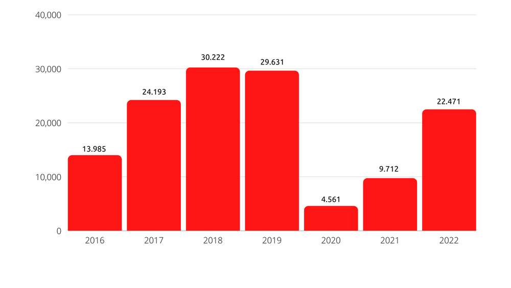 Ιδιαίτερο ενδιαφέρον παρουσιάζει το γεγονός ότι αν και συνήθως η αύξηση της επιβατικής κίνησης ανάμεσα σε Ιούνιο και Ιούλιο είναι σημαντική και (χωρίς να λαμβάνουμε υπόψη τα “προβληματικά” 2020 και 2021 με τους περιορισμούς μετακίνησης) από το 2016 και μετά κινείται σε ποσοστά 15% – 29%, φέτος «έπεσε» στο 6,5%, αφού τον Ιούλιο με πτήσεις εξωτερικού έφτασαν στη Μυτιλήνη μόλις 1.471 περισσότεροι επισκέπτες απ’ ό,τι τον προηγούμενο μήνα.
