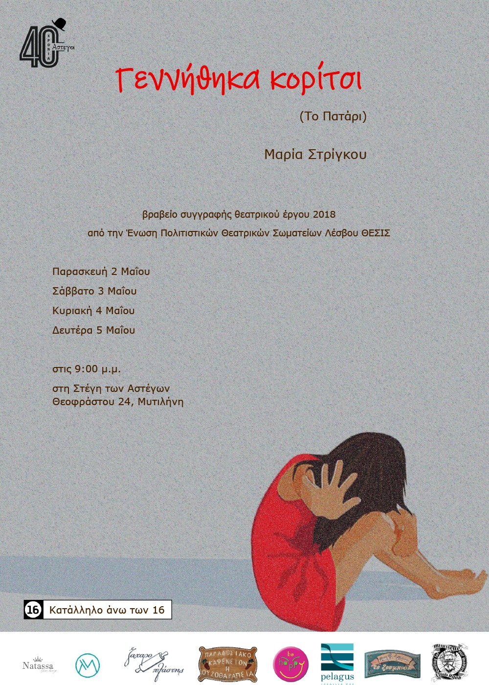 Για ακόμη τέσσερις παραστάσεις ανεβαίνει ξανά στη σκηνή το θεατρικό έργο “Γεννήθηκα κορίτσι (Το Πατάρι)” της Μαρίας Στρίγκου. Συγκεκριμένα το κοινό έχει την ευκαιρία να το απολαύσει την Παρασκευή 2, το Σάββατο 3, την Κυριακή 4 και τη Δευτέρα 5 Μαΐου, στις 9:00 μ.μ., στο θεατράκι των «Αστέγων», στην οδό Θεοφράστου 24.