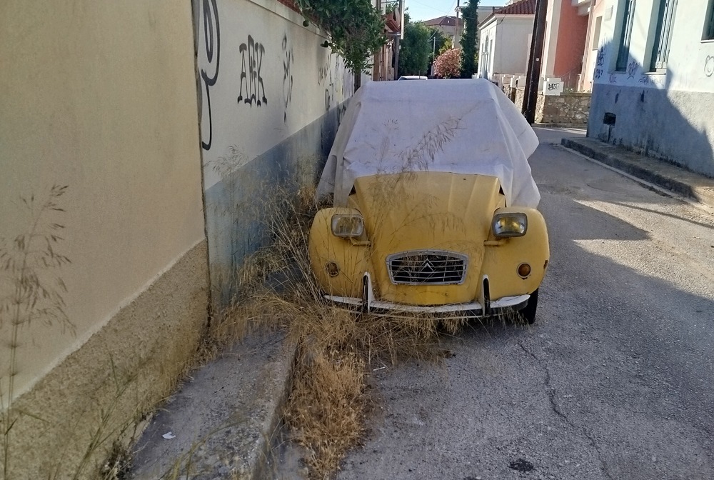 Το εικονιζόμενο Citroen 2CV, συμπαθέστατο και ιστορικό αυτοκίνητο, δεν διαφωνούμε. Βρίσκεται όμως εκεί χρόνια χωρίς πινακίδες, ακινητοποιημένο, χωρίς να έχει τοποθετηθεί κάποια ειδοποίηση από το Δήμο. Προφανώς ανήκει σε κάποιον ιδιοκτήτη γιατί βλέπουμε ότι το παρμπρίζ είναι καλυμμένο από σκίαστρο. Ωστόσο αν ο καθένας μας αφήσει το παλιό του αυτοκίνητο χωρίς πινακίδες στην άκρη του δρόμου στη γειτονιά του, τότε θα γεμίσουμε από μόνιμα κατειλημμένες θέσεις στάθμευσης.