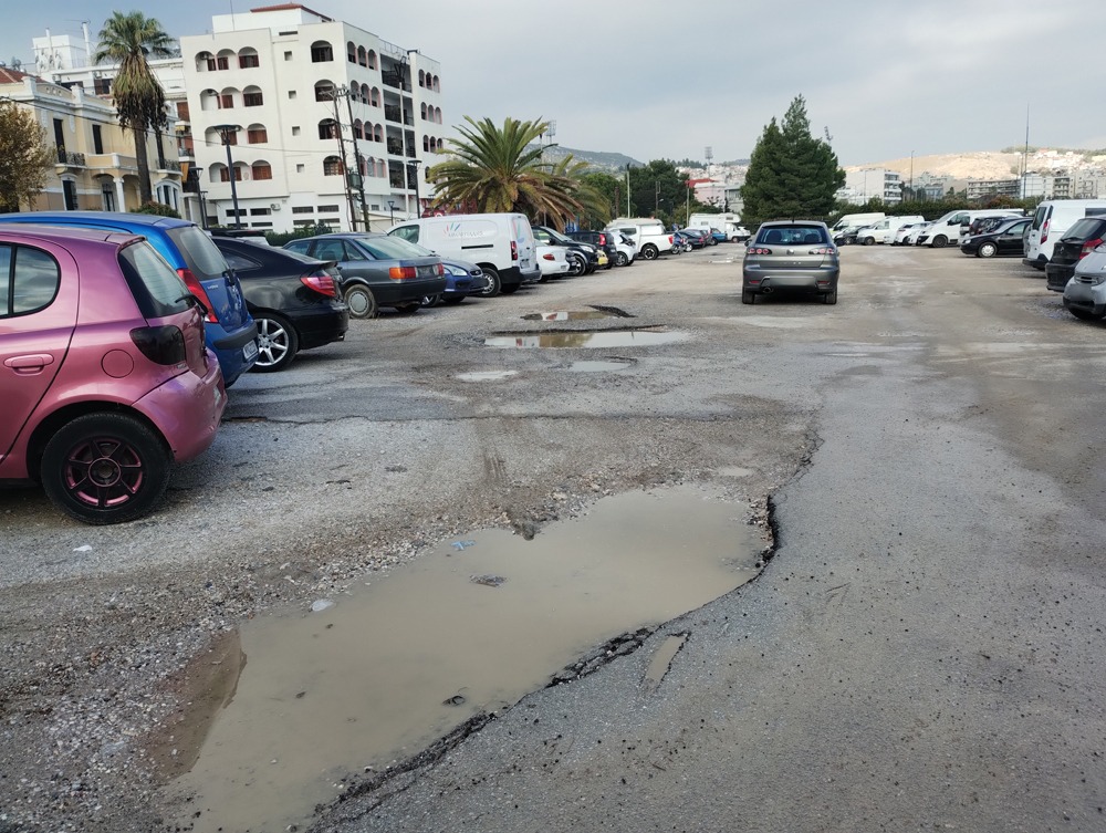Η Μυτιλήνη ως πόλη με τον αριθμό αυτοκινήτων που έχει διψά για ελεύθερους χώρους στάθμευσης και ένας τέτοιος, έστω και ως άτυπο πάρκινγκ, είναι ο χώρος απέναντι από την παλιά Σελάνα στο Ναυτικό Όμιλο. Ο χώρος ανήκει στην Εταιρεία Ακινήτων του Δημοσίου (κτηματική) και η Δημοτική αρχή του Σπύρου Γαληνού το είχε οργανώσει με μία υποτυπώδη ασφαλτόστρωση (δεν ήταν άσφαλτος ακριβώς αλλά διπλή σφραγιστική, που είναι επίστρωση με πετρελαϊκό υλικό και μικρότερη διάρκεια ζωής) και έβαλε και δύο προβολές για να το φωτίζει νυχτερινές ώρες. Σήμερα, βλέπετε ποια είναι η εικόνα σε αυτόν τον χώρο στάθμευσης που χρησιμοποιούν καθημερινά πάνω-κάτω 80 αυτοκίνητα της περιοχής. Λακκούβες και νερά, να μην μπορεί να πατήσει άνθρωπος. Αντί δηλαδή να δώσουμε κίνητρα στους οδηγούς να μην σταθμεύουν έξω από τα σπίτια τους και να αξιοποιούν τέτοιους χώρους, τους διώχνουν από το Δήμο.