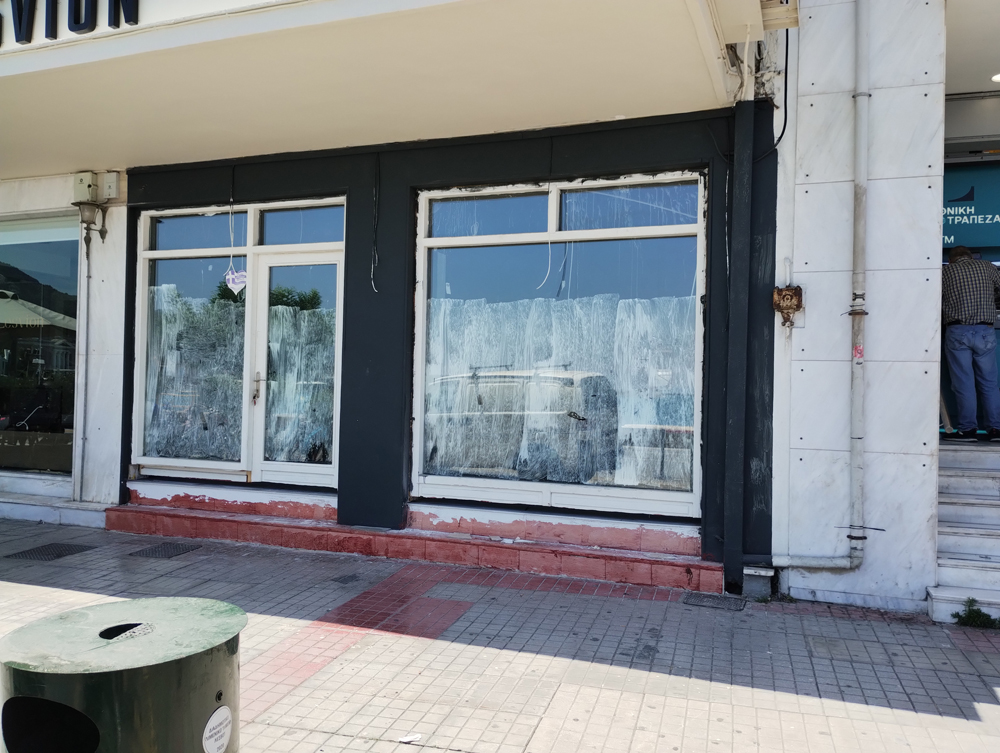 Η πρόσοψη της επιχείρησης που καταργείται ουσιαστικά καθώς έχει καρατομηθεί από τη βάση και βάφεται με σκούρα χρώματα ο τοίχος, για την οποία έγιναν καταγγελίες στον Εμπορικό Σύλλογο