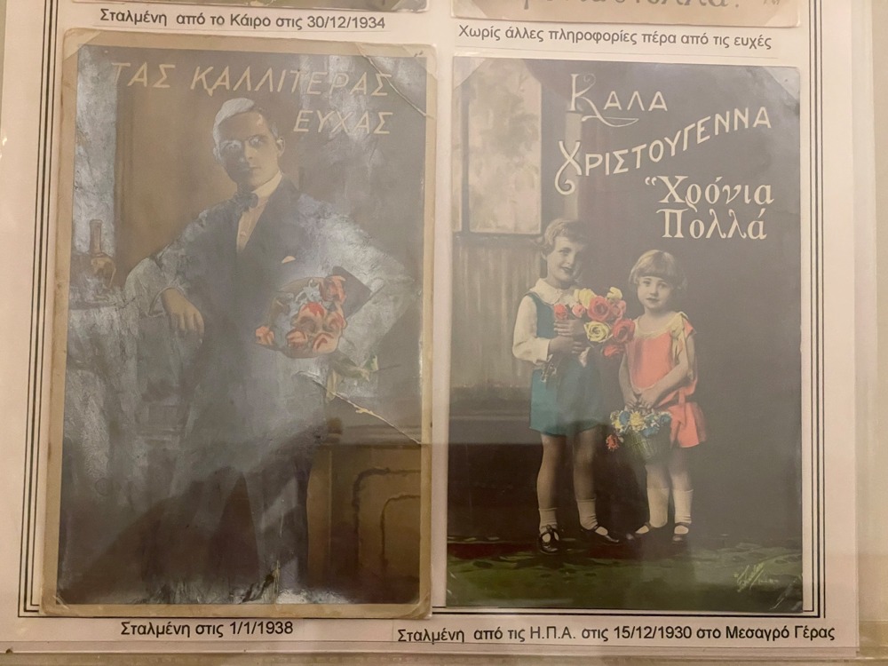 Ευχητήρια κάρτα Χριστουγέννων σταλμένη από τις Η.Π.Α. στο Μεσαγρό το 1930. Οι περισσότερες κάρτες που εκτέθηκαν στην έκθεση είναι γραμμένες και σταλμένες είτε από την Λέσβο είτε προς την Λέσβο, λίγες από αυτές είναι αχρησιμοποίητες