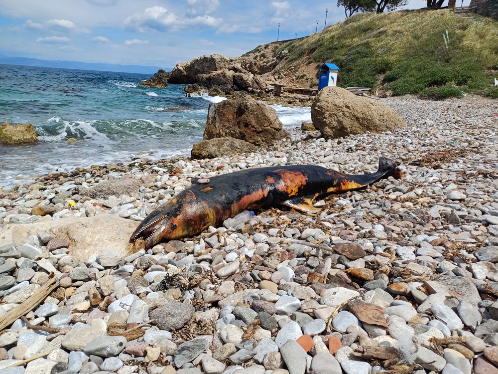 Ένα δελφίνι που δεν έχουμε καμία ενημέρωση για το πώς ξεβράστηκε εκεί, όταν πριν από μερικές εβδομάδες εθεάθη πιθανόν ακόμη και το ίδιο δελφίνι, νεκρό, στην παραλία απέναντι από το εξωκλήσι του Αγίου Γεωργίου στην περιοχή λίγο μετά την παραλία της Θερμής, να παρασύρεται από τα κύματα λόγω του βοριά προς τη Μυτιλήνη.