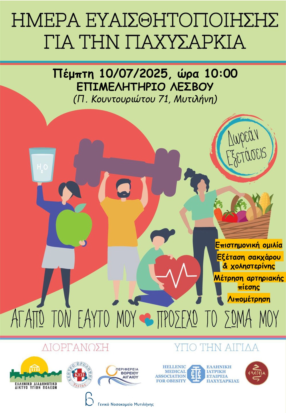 Έχοντας στο επίκεντρο την πρόληψη αλλά και την ενημέρωση και ευαισθητοποίηση του κοινού γύρω από ένα από τα πιο κρίσιμα ζητήματα δημόσιας υγείας της εποχής μας, η Διεύθυνση Δημόσιας Υγείας Λέσβου σε συνεργασία με το Ελληνικό Διαδημοτικό Δίκτυο Υγιών Πόλεων, διοργανώνουν διήμερη δράση με τίτλο «Ημέρα ευαισθητοποίησης για την παχυσαρκία». Η πρωτοβουλία εντάσσεται στο ευρύτερο πλαίσιο προγραμμάτων προληπτικής ιατρικής και τελεί υπό την αιγίδα της Περιφέρειας Βορείου Αιγαίου, η οποία είναι ενεργό μέλος του Δικτύου.