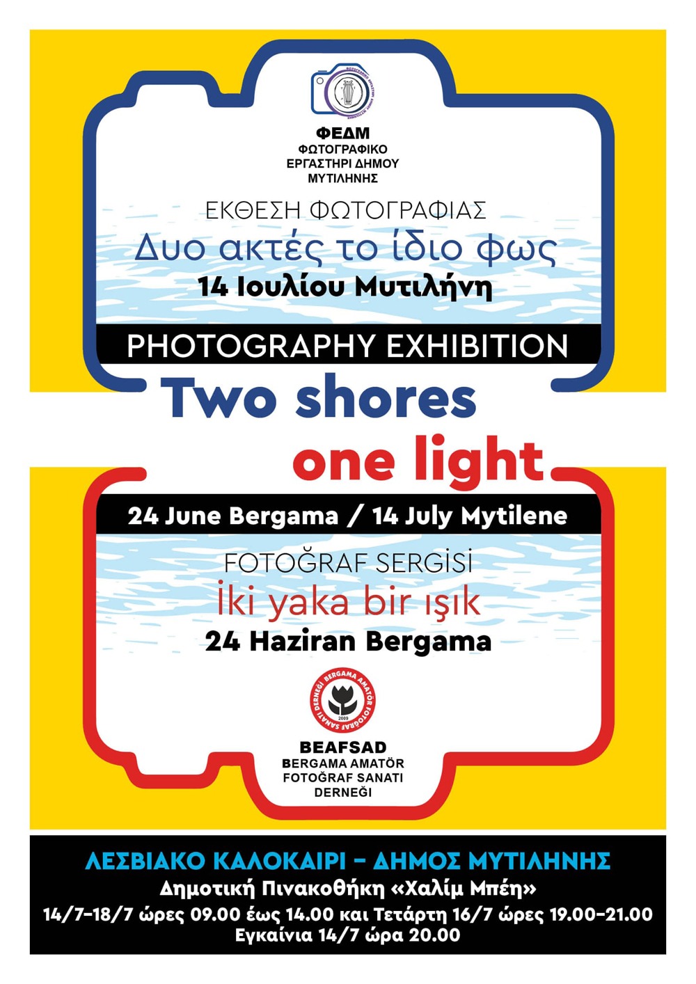 Τη Δευτέρα 14 Ιουλίου, στις 20:00, εγκαινιάζεται στη Δημοτική Πινακοθήκη Μυτιλήνης η κοινή φωτογραφική έκθεση του Φωτογραφικού Εργαστηρίου του Δήμου Μυτιλήνης και της Φωτογραφικής Ομάδας του Δήμου Περγάμου, με τίτλο «Δύο ακτές το Ίδιο Φως».
