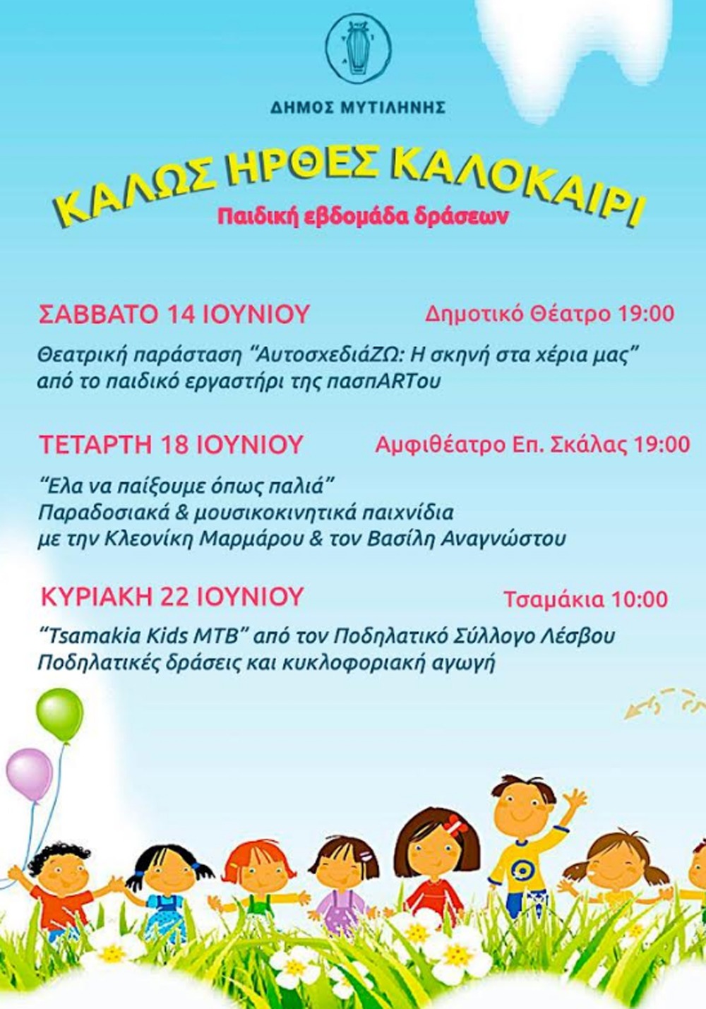 Με μια εβδομάδα παιδικών δράσεων, που ακολουθεί το κλείσιμο των σχολείων, καλωσορίζει ο Δήμος Μυτιλήνης και οι μικροί δημότες το καλοκαίρι από το Σάββατο 14 Ιουνίου έως και την Κυριακή 22 του μηνός.
