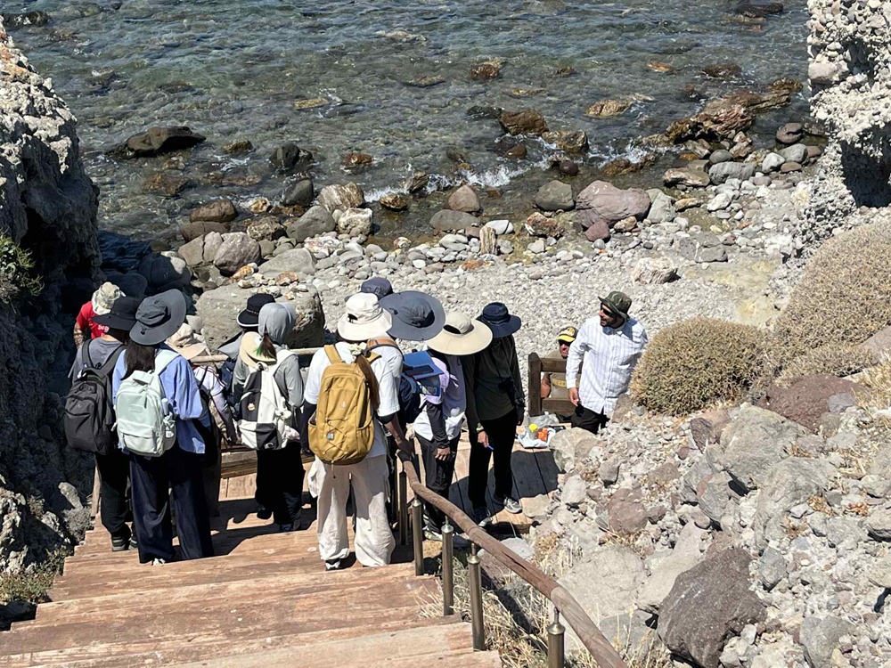 Επίσης οι φοιτητές είχαν την ευκαιρία να γνωρίσουν από κοντά τις απολιθωματοφόρες θέσεις του Σιγρίου, το Πάρκο Απολιθωμένου Δάσους και το Θαλάσσιο Πάρκο Νησιώπης, όπου μελέτησαν το φαινόμενο της ηφαιστειότητας και τα αποτυπώματά της στη δημιουργία του τοπίου. Η εμπειρία εμπλουτίστηκε με επισκέψεις σε γεωλογικά μνημεία σε όλη τη Λέσβο, από τον Λεπέτυμνο έως τον Κόλπο της Γέρας, καθώς και σε περιοχές που συνδέονται με τη σεισμικότητα και τη γεωθερμία του νησιού. Ξεχωριστό ενδιαφέρον είχε και η γνωριμία με το Κτήμα Φάρος στο Σίγρι, όπου ενημερώθηκαν για τον βιολογικό ελαιώνα και τη συμβολή του στην απορρόφηση διοξειδίου του άνθρακα. Παράλληλα, ήρθαν σε επαφή με την τοπική μυθολογία, όπως στο σπήλαιο της Άντισσας που συνδέεται με τον Ορφέα, αλλά και με την παλαιοντολογική ιστορία της περιοχής του Γαβαθά.