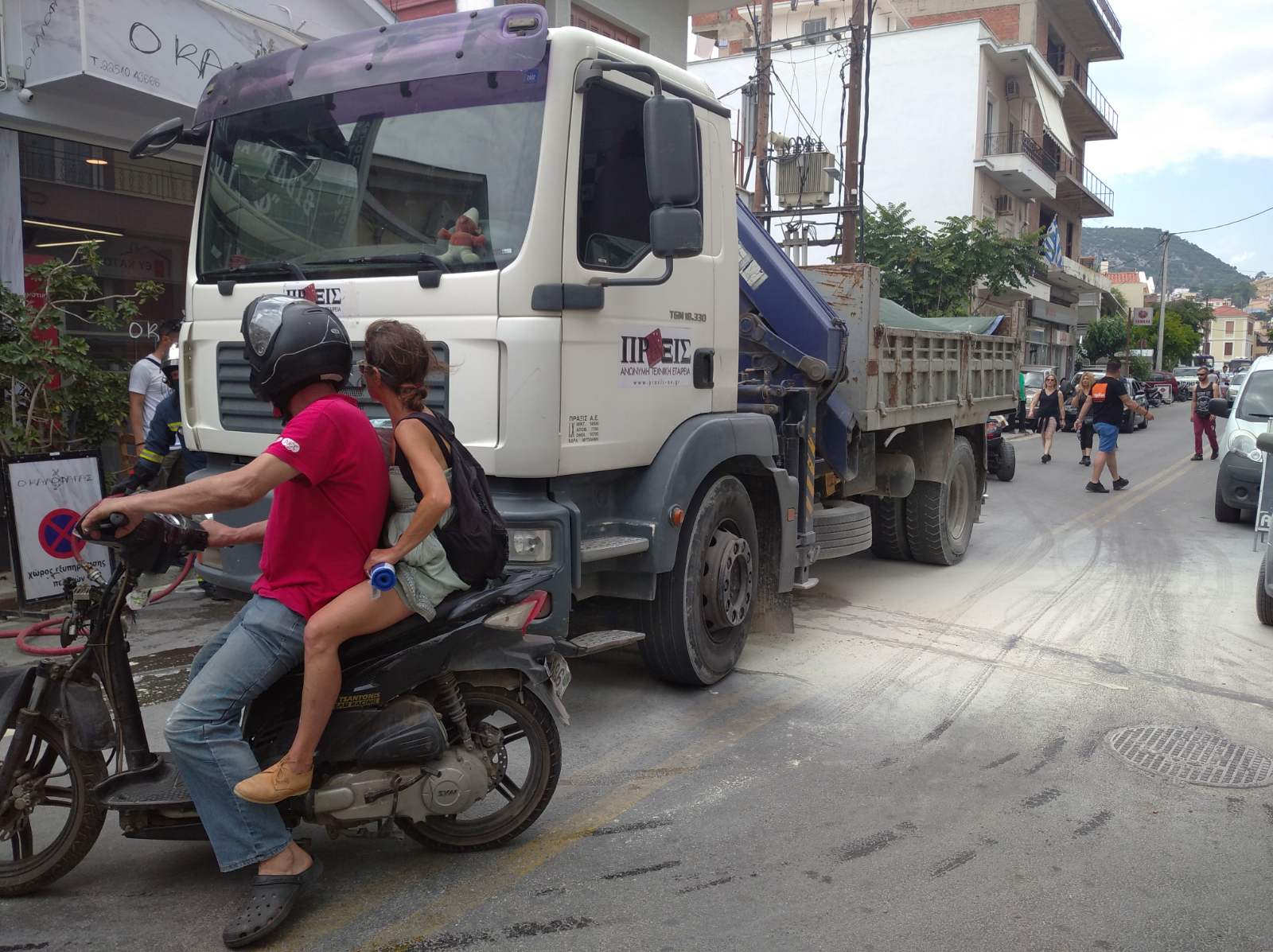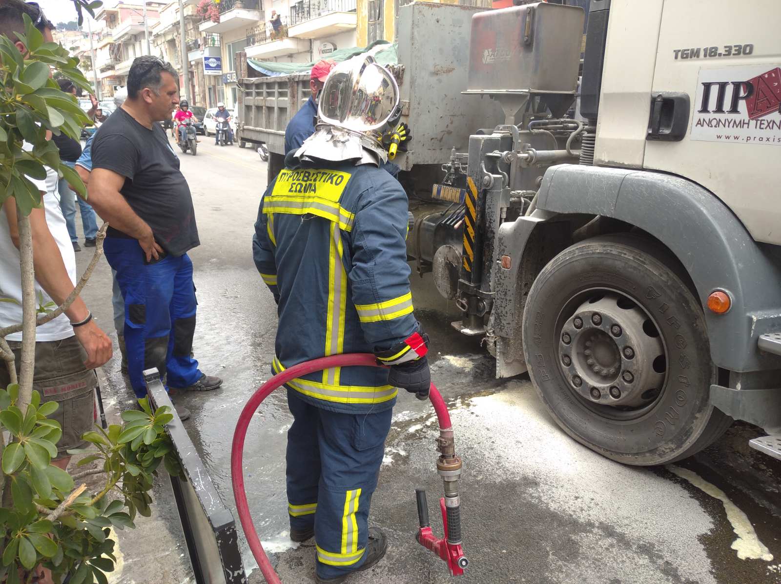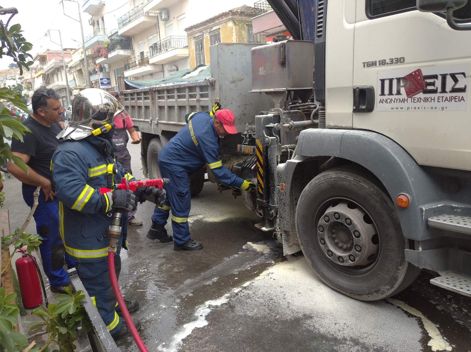 Σοκαρισμένος βγήκε ο οδηγός από το φορτηγό εργοληπτικής εταιρείας στην οποία εργάζεται όταν αντιλήφθηκε ότι είχε πάρει φωτιά το κάτω μέρος του οχήματος.