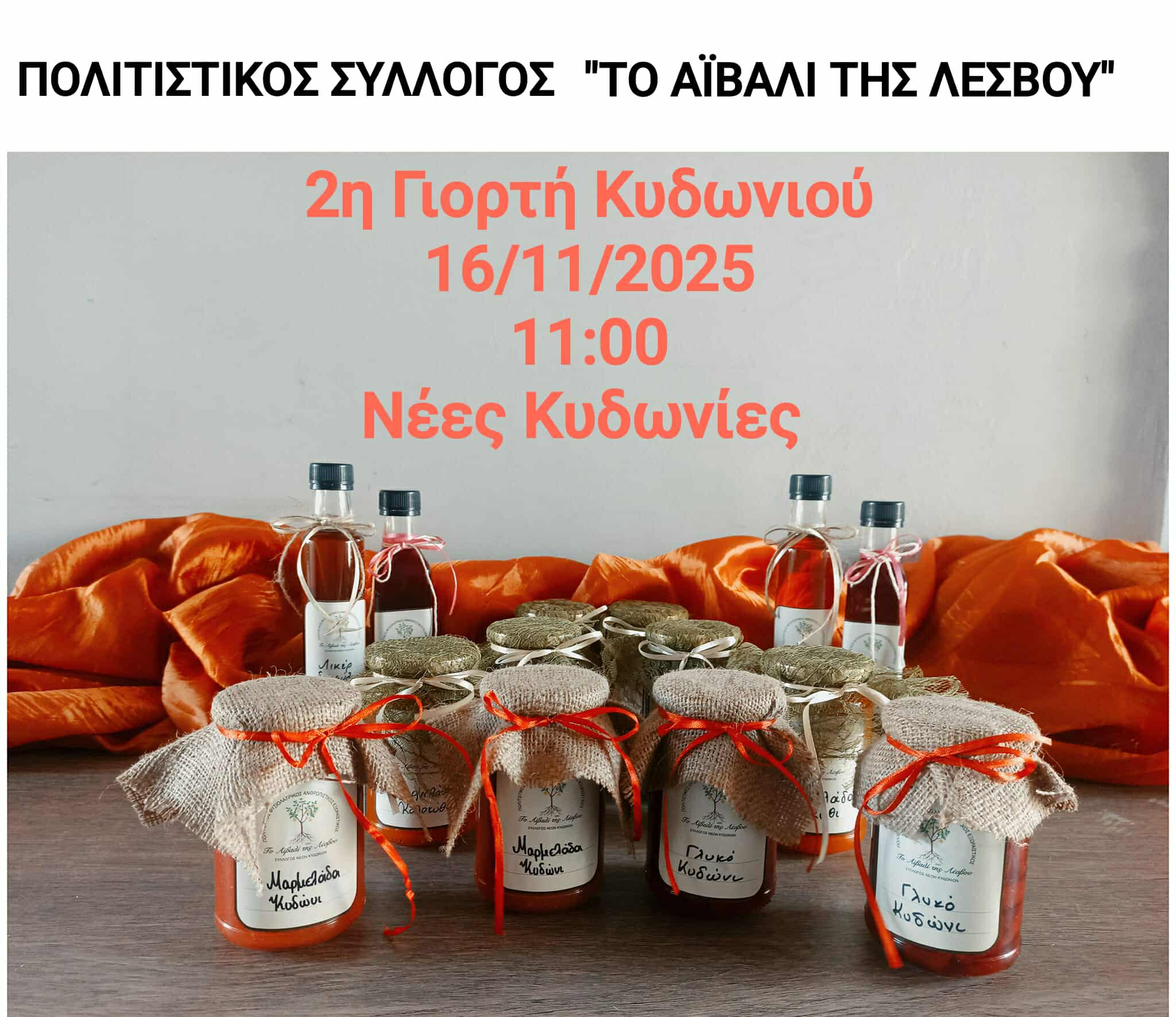 Την άλλη Κυριακή 16 Νοεμβρίου 2025 στις 11:00 θα πραγματοποιηθεί η 2η γιορτή του Κυδωνιού από τον Πολιτιστικό Σύλλογο Νέων Κυδωνιών «Το Αϊβαλί της Λέσβου». Ο Σύλλογος, που ιδρύθηκε το 2023, αποφάσισε να καθιερώσει μια γιορτή που να ταιριάζει με το όνομα του χωριού (Νέες Κυδωνίες) και να αναδείξει την ξεχωριστή γεύση και τα οφέλη του κυδωνιού μέσα από παραδοσιακές δημιουργίες και εδέσματα με βάση το κυδώνι.