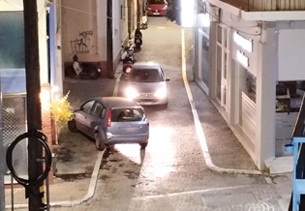 Λίγα λεπτά στο μπαλκόνι των νέων μας γραφείων, αργά το απόγευμα, ήταν αρκετά για να καταγράψουμε το Γολγοθά αυτού του ανθρώπου, που προσπαθεί στο τμήμα της οδού Αρίωνος που βγαίνει από τον Άγιο Θεράποντα να φύγει με το αυτοκίνητό του, αλλά το αυτοκίνητο που είναι σταθμευμένο πάνω στο πεζοδρόμιο και το έχει εγκαταλείψει ο οδηγός του βρίσκεται κατά το ήμισυ κλείνοντας το μισό δρόμο του πλακόστρωτου.