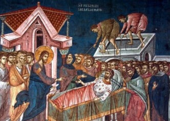 Στο ευαγγέλιο της Κυριακής (Μκ. β΄ 1-12) ο Χριστός βρίσκεται στην Καπερναούμ και, πιο συγκεκριμένα, σ’ ένα σπίτι ασφυκτικά γεμάτο. Εκεί ομιλεί. Μέσα σ’ αυτό το πλήθος κάποιοι άνθρωποι φέρνουν έναν παραλυτικό. Όμως, επειδή δεν μπορούν να περάσουν, ανοίγουν από πάνω την σκεπή και τον κατεβάζουν από εκεί στον Κύριο, ώστε να τον θεραπεύσει. Ο Χριστός είδε την πίστη τού παραλυτικού και, αντί να του πει «είσαι θεραπευμένος απ’ την ασθένεια», του λέει πως «είναι συγχωρεμένες οι αμαρτίες σου».