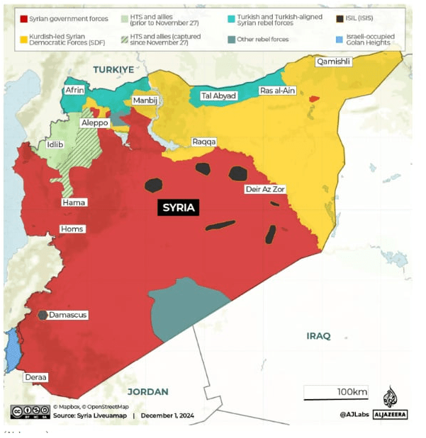 Η Συρία, μετά από περισσότερο από μια δεκαετία εμφυλίου πολέμου, βρίσκεται σε μια κατάσταση εξαιρετικά εύθραυστη, με το ενδεχόμενο μιας de facto διαίρεσης να φαίνεται πιο πιθανό από ποτέ. Η πιθανότητα τετραχοτόμησης της χώρας, αν και προς το παρόν δεν έχει αναγνωριστεί επίσημα, αποτελεί αντικείμενο σοβαρών γεωπολιτικών αναλύσεων και προβληματισμών, καθώς οι συνέπειες της διαίρεσης αυτής επηρεάζουν την ευρύτερη περιοχή της Ανατολικής Μεσογείου. Μια τέτοια εξέλιξη θα είχε σημαντικές επιπτώσεις στην οριοθέτηση θαλάσσιων ζωνών και στη δυναμική των διεθνών σχέσεων, ιδιαίτερα σε σχέση με τις αμφισβητούμενες ΑΟΖ στην περιοχή.