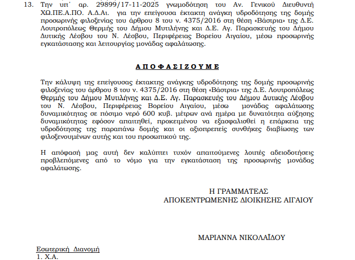 Το πράσινο φως για να προχωρήσει το Υπουργείο Μετανάστευσης στην κατασκευή μονάδας αφαλάτωσης για την υδροδότηση της Bάστριας δίνει με απόφαση της Αποκεντρωμένη Διοίκηση Αιγαίου ανοίγοντας το δρόμο για την αντιμετώπιση ενός εκ των βασικών ζητημάτων της φαραωνικής δομής που είναι το πως θα υδροδοτούν τους χιλιάδες μετανάστες που σκοπεύουν να μεταφέρουν στην περιοχή. Όπως έχουν γράψει ήδη πρωτοσέλιδα τα Νέα της Λέσβου, το έδαφος έχει προετοιμαστεί από τις πρόσφατες αποφάσεις που ουσιαστικά παρακάμπτουν το ρόλο των ΔΕΥΑ σε αυτά τα ζητήματα καταπνίγοντας ουσιαστικά τη βούληση των τοπικών κοινωνιών. Η ΔΕΥΑΛ έχει ταχθεί αρνητικά στη μονάδα και το ζήτημα αυτή τη στιγμή δεν είναι το αν θα κατασκευάσουν στην παραλιακή πλευρά προς Καράβα τη μονάδα αφαλάτωσης αλλά πως θα γίνουν τα δίκτυα ύδρευσης που θα φτάσουν μέχρι το νέο ΚΥΤ;; Για να γίνουν τα δίκτυα θα πρέπει εκ των πραγμάτων να δώσουν εγκρίσεις οι Δήμοι Μυτιλήνης ή Δυτικής Λέσβου αναλόγως από ποιες εκτάσεις θα περάσουν οι σωληνώσεις. Στη συγκεκριμένη όμως περίπτωση και οι Δήμοι να ταχθούν αρνητικοί (που θα ταχθούν!) υπάρχει σολομώντεια λύση! Να περάσουν το δίκτυο ύδρευσης μέσα από το δάσος Κάνοντας την παγκόσμια πρωτοτυπία στη Λέσβο το δάσος της Φεράνας να είναι η μόνη παρθένα δασική έκταση σε ευρωπαϊκό έδαφος από την οποία διέρχεται δίκτυο ύδρευσης πολλών χιλιομέτρων! Καταλύοντας με αυτόν τον τρόπο κάθε έννοια δικαίου. Άλλωστε και το ΚΥΤ στον Καρά Τεπέ αλλά και οι εξελίξεις για τη Βάστρια πάνω σε αυτήν την τακτική βασίστηκαν! Τακτική «έκτακτης ανάγκης» και παράκαμψης του νόμου. Ως προς αυτό όμως οι ευθύνες είναι πολύ σοβαρές και για το ρόλο που έπαιξαν τοπικοί φορείς ανοίγοντας το δρόμο για να έχει σήμερα το Υπουργείο Μετανάστευσης το άλλοθι να «πατάει» πάνω στην λειψυδρία της Λέσβου γιατί αυτός είναι ο άξονας πάνω στον οποίο κινείται η Απόφαση της Αποκεντρωμένης Διοίκησης Αιγαίου.