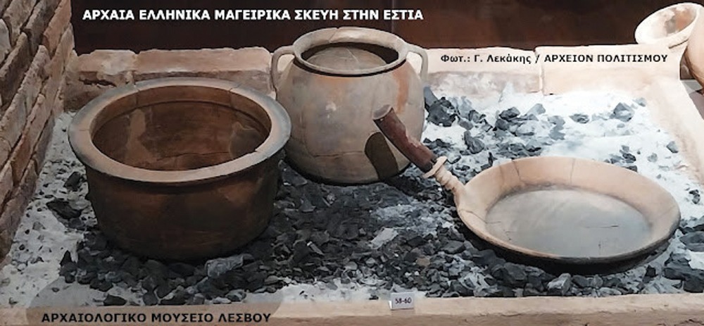 Η μαγειρική στην αρχαία Λέσβο γινόταν με σκεύη από πηλό και μέταλλο, που ψήνονταν είτε πάνω στη φωτιά είτε μέσα σε φούρνους από πηλό. Οι γάστρες, τα πήλινα δοχεία με καπάκι, αποτελούσαν ένα από τα σημαντικότερα εργαλεία. Μέσα σε αυτές ψήνονταν κρέατα, ψάρια, λαχανικά και όσπρια με τρόπο που διατηρούσε τα αρώματα και τη θρεπτική αξία των υλικών. Οι τριποδικές χύτρες χρησιμοποιούνταν για βραστά, ενώ οι πλακοειδείς πλίνθοι (πέτρινες πλάκες) εξυπηρετούσαν στο ψήσιμο άρτων ή πιτών.