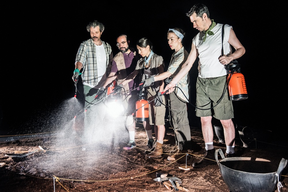 Στη σκηνή στήνεται μια παράδοξη, υπαρξιακή ανασκαφή που τα ευρήματά της δεν είναι, αυτή τη φορά, αγγεία ή αρχιτεκτονήματα, αλλά θεατρικοί στίχοι, λόγια αρχαίων ηθοποιών, σπασμένα σε μικρά κομμάτια. Πέντε ερμηνευτές-αρχαιολόγοι, εφοδιασμένοι σκάβουν, ακολουθώντας τη σχεδόν τελετουργική διαδικασία μιας αρχαιολογικής ανασκαφής, όπως αυτή εξελίσσεται κατά τη διάρκεια μιας ημέρας. Και μέσα από τα σκάμματά τους ξεπηδούν στιγμιότυπα αρχαίων παραστάσεων και λεπτομέρειες της καθημερινής ζωής των θεάτρων, όπου θα πραγματοποιηθεί το έργο.