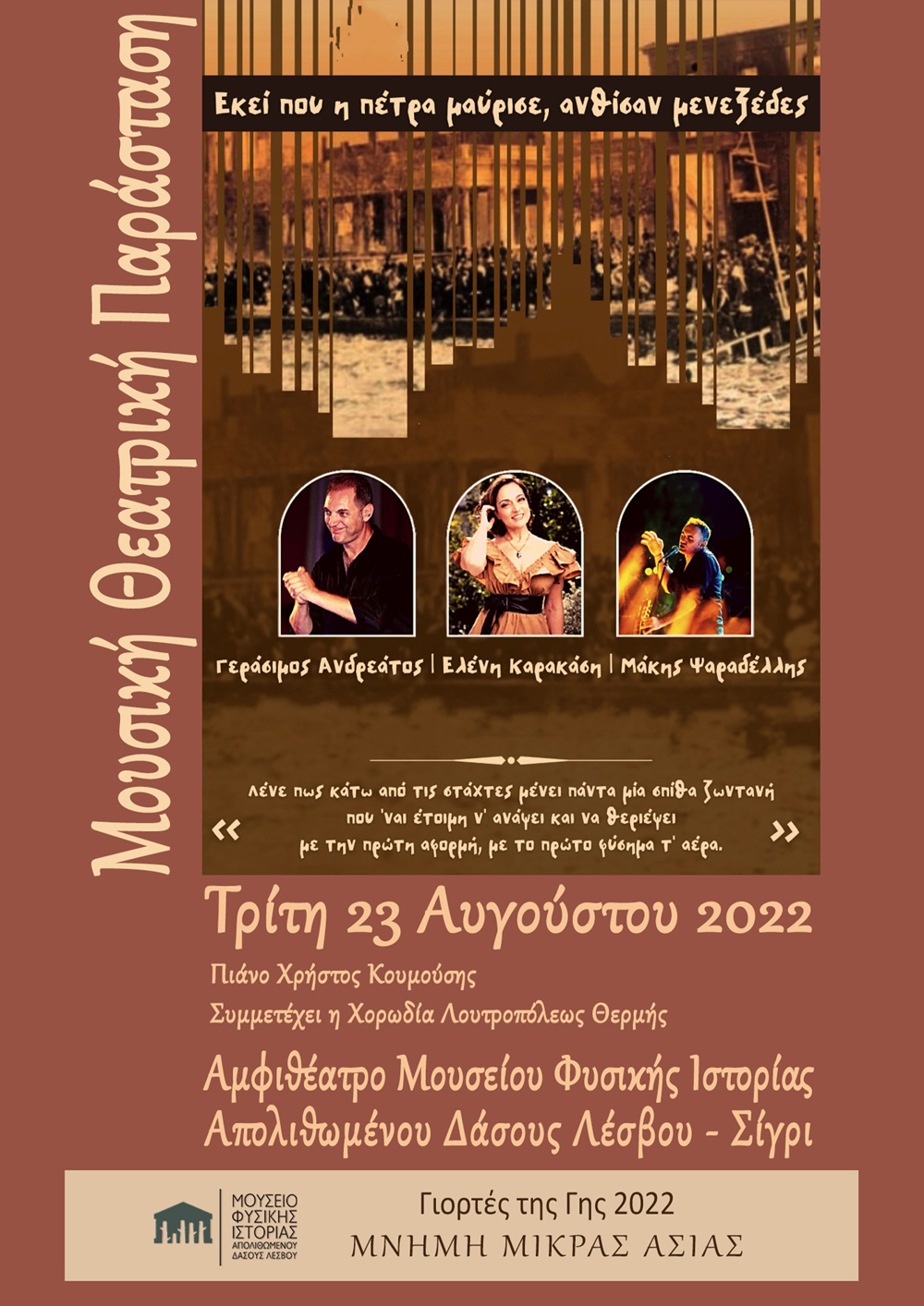 Τη μουσική παράσταση «Εκεί που η πέτρα μαύρισε ανθίσαν μενεξέδες» του Γεράσιμου Ανδρεάτου και του Μάκη Ψαραδέλλη σε σκηνοθεσία της Ελένης Καρακάση, θα φιλοξενήσει το Μουσείο Φυσικής Ιστορίας Απολιθωμένου Δάσους Λέσβου, στο υπαίθριο αμφιθέατρό του, την Τρίτη 23 Αυγούστου, στις 20:30, στα πλαίσια των καλοκαιρινών του εκδηλώσεων «Γιορτές της Γης».