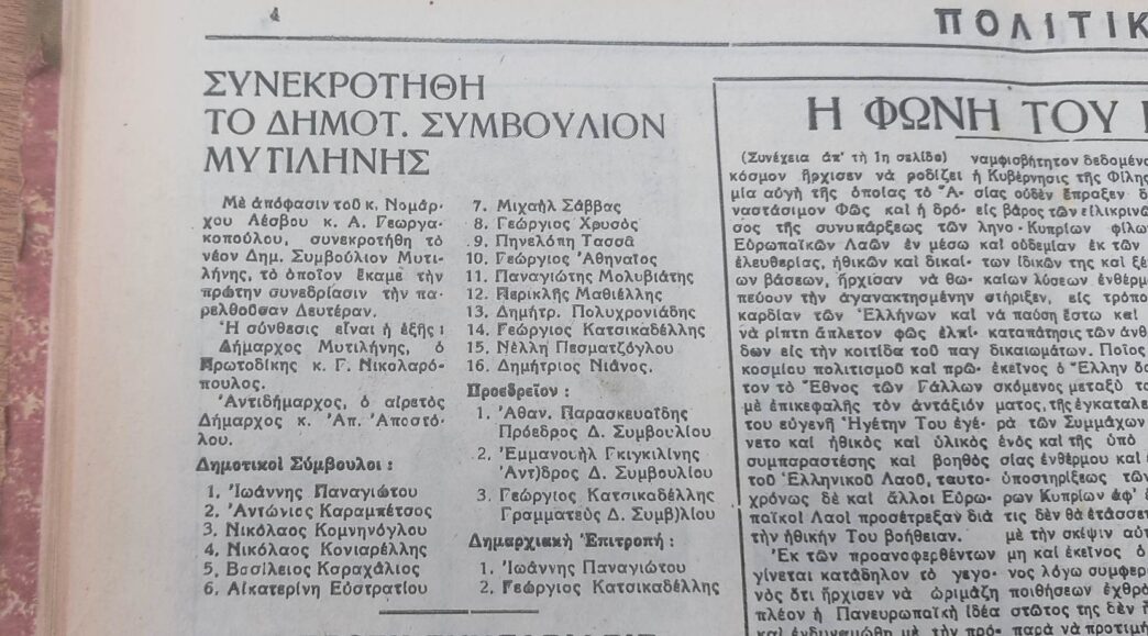 Με την πτώση της χούντας η Κυβέρνηση Εθνικής Ενότητας επανέφερε τους αιρετούς δημοτικούς άρχοντες διορίζοντας όμως δικαστικούς ως Δημάρχους. Οι αιρετοί εγκαθίστανται ως Αντιδήμαρχοι μέχρι την ημέρα των εκλογών. Στο Δήμο Μυτιλήνης διορισμένος Δήμαρχος ήταν ο Ευστράτιος Γαβριήλ, ο οποίος μετά την μεταπολίτευση, υπέβαλλε την παραίτησή του. Δήμαρχος Μυτιλήνης εγκαθίσταται ο Πρωτοδίκης Γρηγόριος Νικολαρόπουλος, Νομάρχης Λέσβου ο Αντώνης Γεωργακόπουλος με αναπληρωτή του τον Παναγιώτη Γαλανόπουλο. Η πλήρης σύνθεση του Δημοτικού Συμβουλίου Μυτιλήνης εμφανίζεται στον παραπάνω Πίνακα