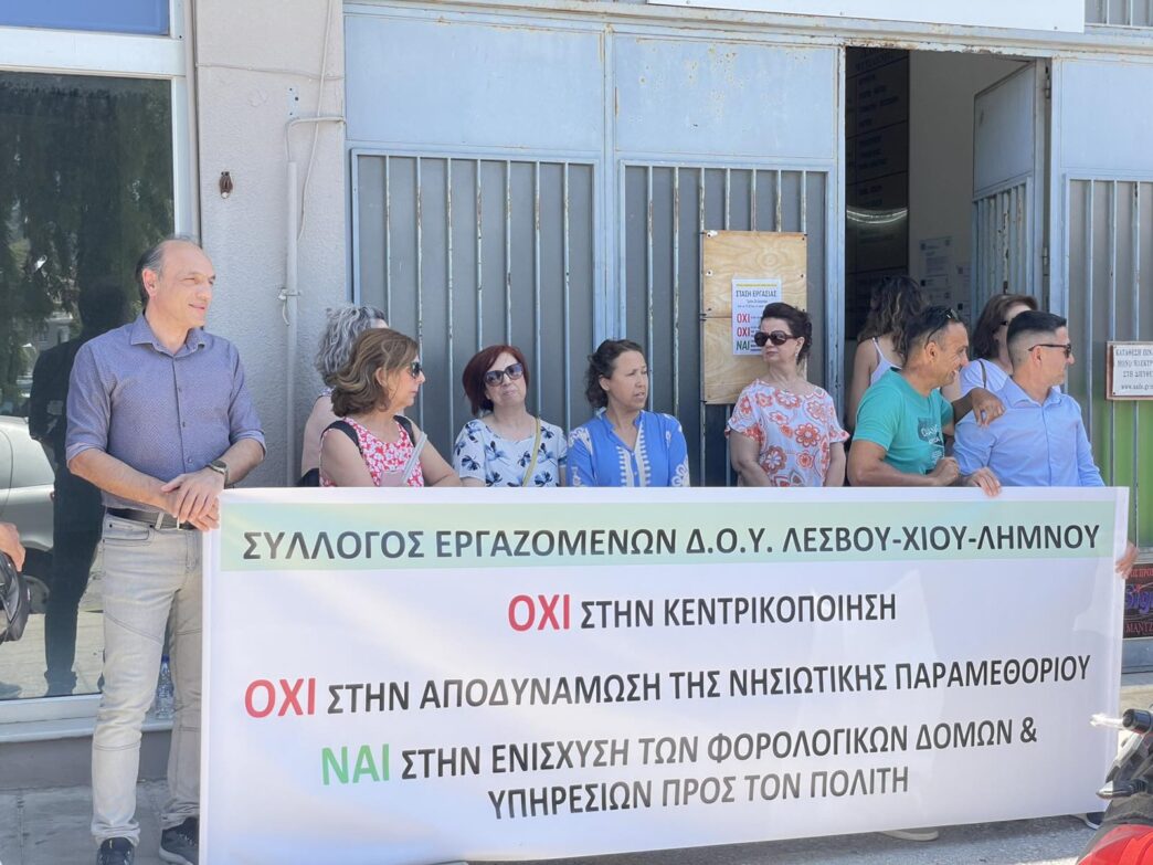 Όλοι στο πλευρό των Εφοριακών βρίσκονται αυτήν την ώρα έξω από την Εφορία Μυτιλήνης δηλώνοντας την αντίθεσή τους ακόμα και στις σκέψεις για ενδεχόμενο συγχώνευσης των Εφοριών από τα νησιά με τις κεντρικές υπηρεσίες. Να σημειωθεί ότι σήμερα από τις 12:30 το μεσημέρι οι Εφοριακοι έχουν προχωρήσει σε στάση εργασίας μέχρι τη λήξη του ωραρίου τους και διαδήλωση στην είσοδο του κτιρίου της ενώ ο Σύλλογός τους το προηγούμενο διάστημα έκανε έναν ευρύτατο κύκλο ενημέρωσης των τοπικών παραγόντων και συνδικαλιστικών φορέων για οσα τους έχουν ανησυχήσει.