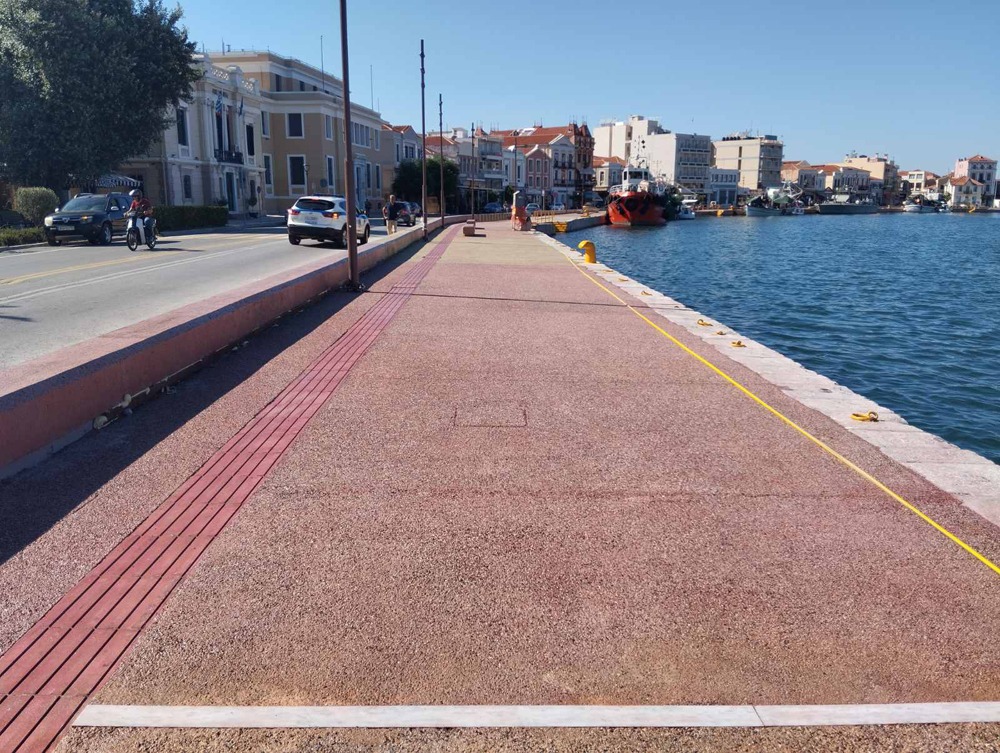 Επίσης υποστήριξε ότι «η ακατάλληλη ράμπα παραμένει ως έχει στην περιοχή της στάσης λεωφορείων έναντι πλατείας Σαπφούς, δεν εκτελέστηκε καμία εργασία και οι άτεχνες διαμορφώσεις παραμένουν πέριξ του κάβου πρόσδεσης πλοίων και Pillar εξυπηρέτησης σκαφών, δεν εκτελέστηκε καμία εργασία και το μη επιστρωμένο με βερνίκι δάπεδο παραμένει έναντι καφετέριας “Monkey”, όπως και στα τμήματα που έγινε επέμβαση μετά την κατασκευή του βοτσαλωτού δαπέδου (π.χ. ράμπα έναντι πλατείας Σαπφούς), οι αρμοί επισκευάστηκαν εν μέρει κυρίως στο τμήμα από το κτίριο της Περιφέρειας έως την οδό Νιάνια, ενώ έως την οδό Αλκαίου για την αποκατάσταση χρησιμοποιήθηκε απόχρωση που δεν συνάδει με το τοιχίο, επισκευάστηκαν μερικώς οι ρωγμές κυρίως στο τμήμα από Περιφέρεια έως οδό Αλκαίου, εκτελέστηκαν ελάχιστες εργασίες λείανσης του εξωτερικού τμήματος τοιχίου από πλατεία Σαπφούς έως Περιφέρεια και μάλιστα εντελώς αποσπασματικά και με παράλληλη αποσπασματική επίστρωση με βερνίκι, εκτελέστηκαν μερικώς εργασίες για τα τμήματα των τοιχίων στις περιοχές όπου έχουν κατασκευαστεί ράμπες πρόσβασης (τριγωνικά τμήματα), έγιναν αποσπασματικές εργασίες επιδιόρθωσης της ταινίας LED πλησίον Περιφέρειας, παραμένουν αρκετά σημεία αποσάθρωσης του αρμού άνωθεν των ταινιών led στο τμήμα από ξενοδοχείο “Blue Sea” έως καφετέρια “Monkey” τόσο στο τοιχίο όσο και στα παγκάκια, κλπ.».