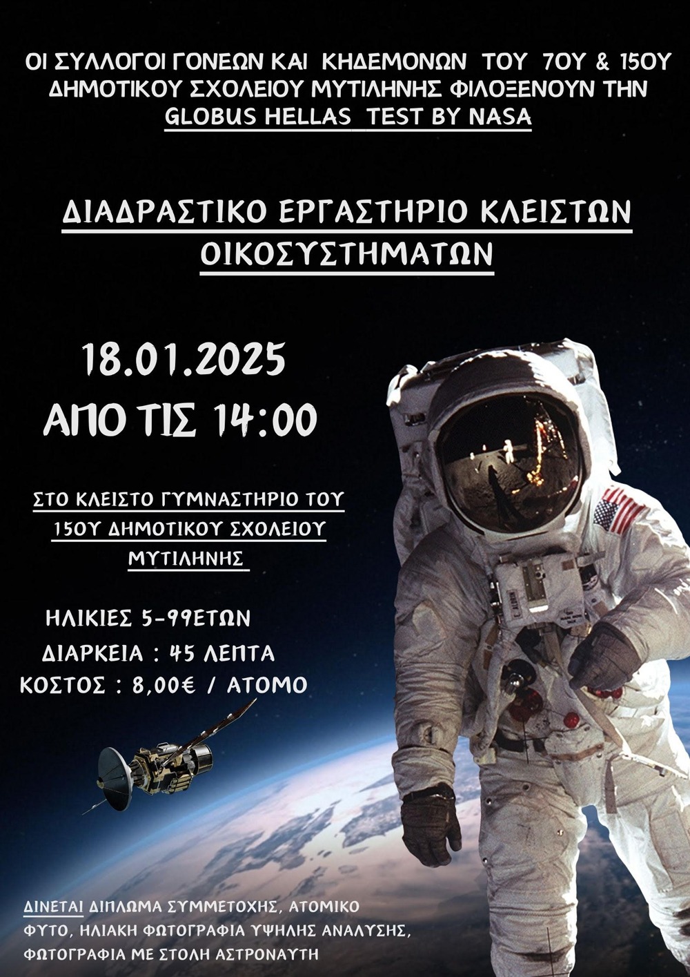 Μια ενδιαφέρουσα νέα δράση που θα μας ταξιδέψει νοητά στο διάστημα θα πραγματοποιηθεί αυτό το Σάββατο 18 Ιανουαρίου, αφού με πρωτοβουλία του 7ου Δημοτικού Σχολείου και σε συνεργασία με το Σύλλογο του 15ου Δημοτικού, θα φιλοξενηθεί η Globus Hellas test by NASA στο χώρο του κλειστού γυμναστηρίου του 15ου Δημοτικού Σχολείου.