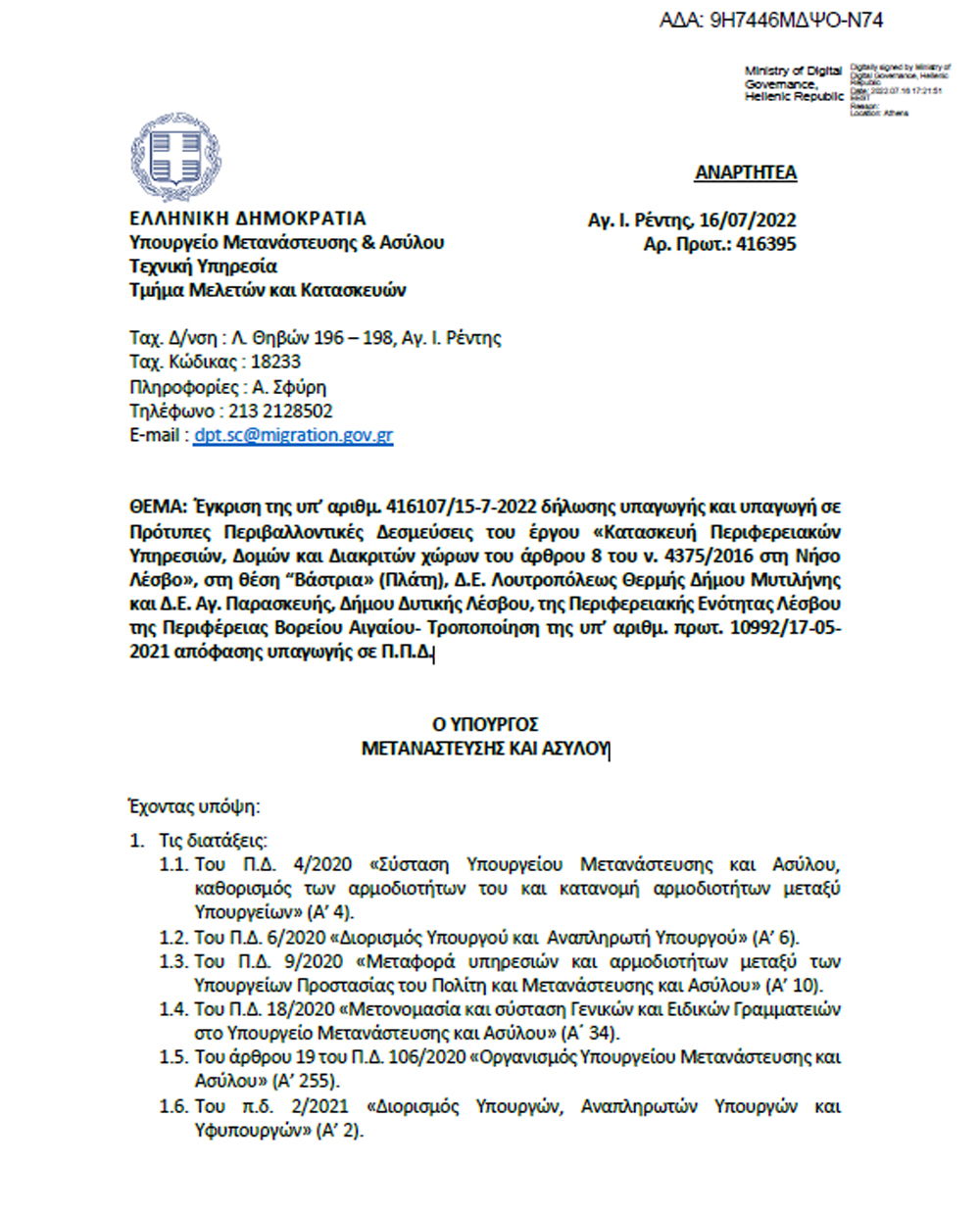 Το ότι έχει συμμορφωθεί πλήρως με τις πρόσφατες αποφάσεις και τη νομολογία του Συμβουλίου της Επικρατείας, και ως εκ τούτου προχωρώντας ταυτόχρονα σε απαραίτητες ενέργειες συνεχίζει την πραγματοποίηση εργασιών για τη δημιουργία της νέας δομής στη Βάστρια, υποστηρίζει με ανακοίνωσή του το Υπουργείο Μετανάστευσης & Ασύλου.