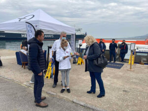 Με λάντζες αποβιβάστηκαν οι Αμερικανοί τουρίστες στο λιμάνι όπου τους καλωσόρισαν ο Γ. Μουτζούρης και η Μ. Χατζησάββα