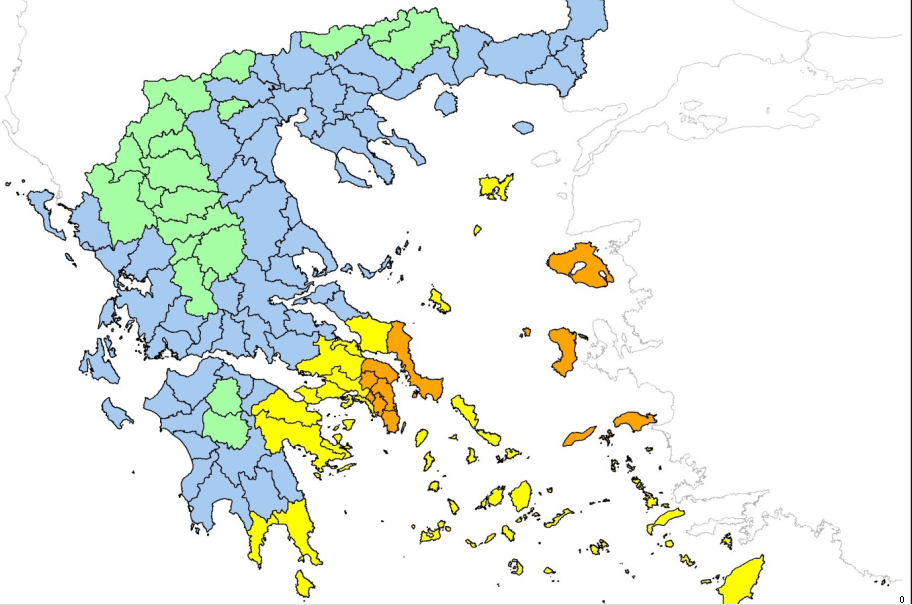 Στο χάρτη του Υπουργείου Κλιματικής Κρίσης και Πολιτικής Προστασίας, η Λέσβος και το Βόρειο Αιγαίο έχουν σημανθεί με το ΠΟΡΤΟΚΑΛΙ χρώμα που παραπέμπει σε πολύ υψηλό κίνδυνο πυρκαγιάς, ένα σκαλοπάτι πριν το κόκκινο που είναι η κατάσταση συναγερμού.