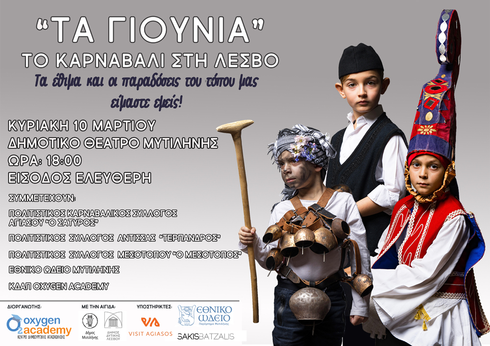 Καρναβαλική εκδήλωση «Τα Γιούνια» θα πραγματοποιήσει το Oxygen Academy-ΚΔΑΠ (Κέντρο Δημιουργικής Απασχόλησης Παιδιών σχολικής ηλικίας) την ερχόμενη Κυριακή, στις 6 το απόγευμα, στο Δημοτικό Θέατρο Μυτιλήνης. Μια βραδιά αφιερωμένη στις απόκριες, όπως αυτές γιορτάζονται παραδοσιακά στη Λέσβο. Σκοπός της εκδήλωσης είναι να παρουσιαστούν τα ήθη, τα έθιμα και οι παραδόσεις των ημερών, στα παιδιά από παιδιά, από τρία χωριά του νησιού με μεγάλη παράδοση στον εορτασμό του Καρναβαλιού.