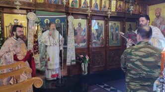 Σημαιοστολισμένος από την περασμένη εβδομάδα ο ναός δέχτηκε σήμερα την Τίμια Κάρα του Αγίου Θεοδώρου νεομάρτυρα του Βυζαντίου την οποία μετέφερε από τον μητροπολιτικό ναό Μυτιλήνης ο μητροπολίτης Ιάκωβος ο οποίος πλαισιωμένος από ιερείς τελεί αυτήν την ώρα τη Θεία Λειτουργία παρουσία του Στρατιωτικού Διοικητή Λέσβου και άλλων αξιωματικών καθώς και πιστών.