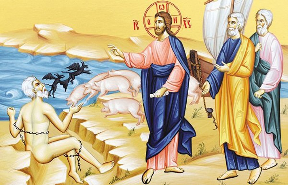 Στο ευαγγέλιο της Κυριακής (Λκ. η΄ 27-39) ο Κύριος θεραπεύει τον δαιμονισμένο στη χώρα των Γαδαρηνών. Μάλιστα, επιτρέπει στα δαιμόνια, μετά από παράκλησή τους και εφόσον απελευθερώθηκε ο άνθρωπος, να εισέλθουν στους χοίρους. Όταν εισήλθαν στους χοίρους, αυτοί έπεσαν απ’ τον γκρεμό και πνίγηκαν. Τότε, οι κάτοικοι της γης των Γαδαρηνών ζήτησαν απ’ τον Κύριο να φύγει από κοντά τους, γιατί τους κατέλαβε φόβος.