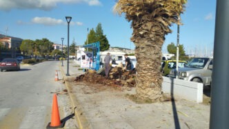 Άλλος ένας φοίνικας καρατομήθηκε χθες στο Μακρύ Γιαλό προσβεβλημένος από το κόκκινο σκαθάρι, καθώς δεν έχουν ληφθεί ιδιαίτερα μέτρα για την προστασία των δέντρων που απέμειναν.