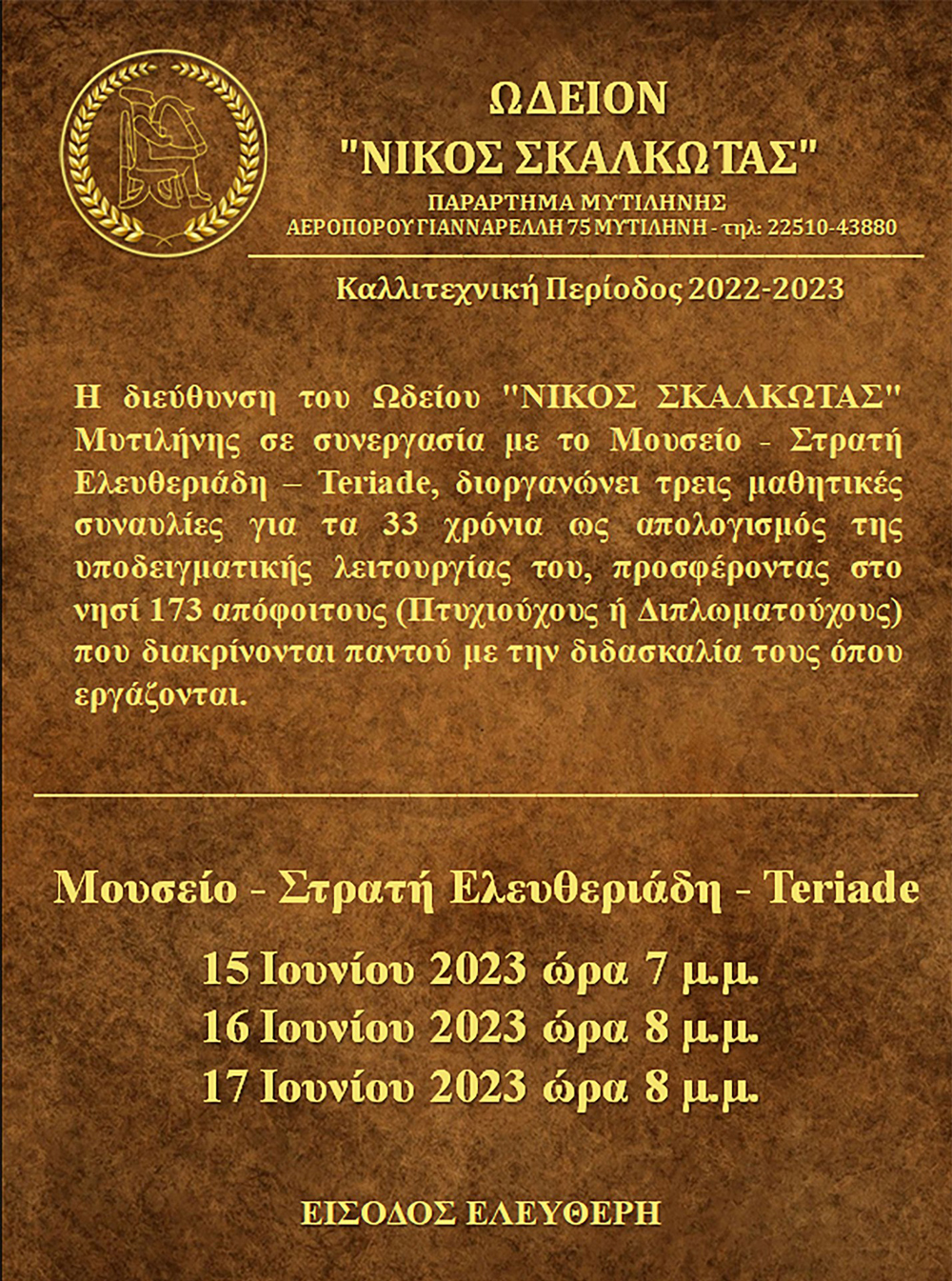 Ένα μοναδικό τριήμερο συναυλιών θα παρουσιάσει σήμερα, αύριο και το Σάββατο το Ωδείο ‘’Νίκος Σκαλκώτας’’ με ώρα έναρξης τις 7 σήμερα και τις 8 το βράδυ αύριο και μεθαύριο, με ελεύθερη είσοδο για το κοινό στον ολάνθιστο προαύλειο χώρο του Μουσείου Θεόφιλου-Teriade στην Βαρειά.