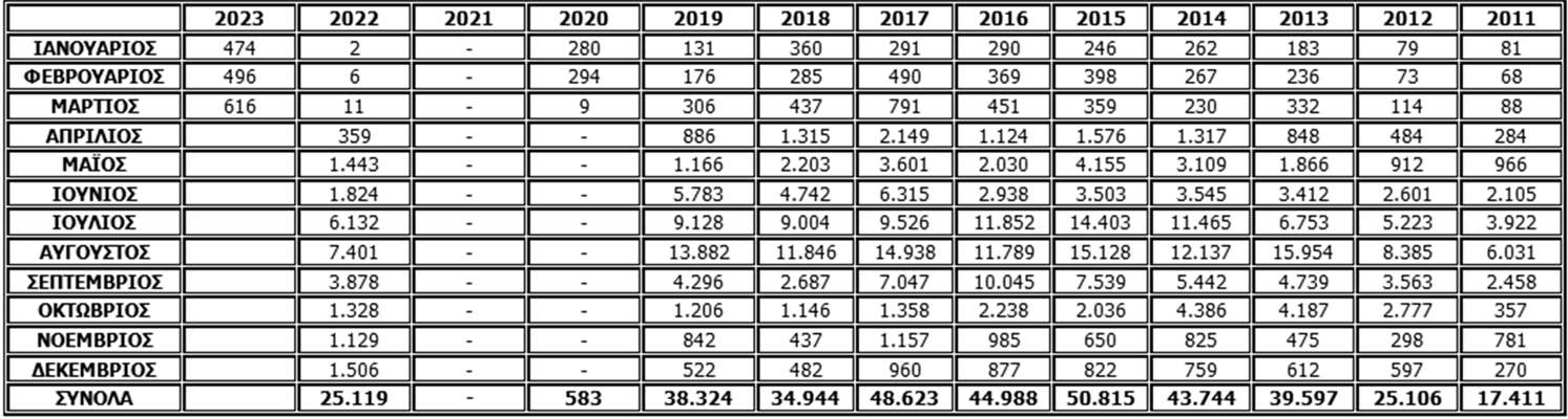 Σύμφωνα με τα στοιχεία των αφίξεων, ο φετινός Απρίλιος είναι μέχρι τώρα ο καλύτερος όλων των εποχών και μάλιστα με διαφορά, μια και η αύξηση κυμαίνεται από το 60% και υπερβαίνει και το 100% για κάποιες χρονιές και δεν αναφερόμαστε στα πρώτα χρόνια που ξεκίνησε το τουριστικό ρεύμα από απέναντι, δηλαδή ΔΕΝ συγκρίνουμε τους μικρούς αριθμούς των ετών 2011, 2012 και 2013 που βλέπετε στον πίνακά μας, αλλά ξεκινάμε τη σύγκριση από το 2014 και μετά. Η μόνη χρονιά κατά την οποία οι αφίξεις – αν και υπολείπονται – πλησιάζουν στα σημερινά δεδομένα είναι το 2017 με 2.149 επισκέπτες. Ωστόσο αυτή η διαφορά θα μεγαλώσει όταν προστεθούν οι αφίξεις του προσεχούς σαββατοκύριακου στα συνολικά στοιχεία του Απριλίου του 2023.