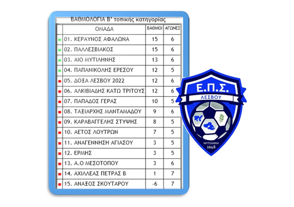 Αγωνιστική δράση με τέσσερις νίκες γηπεδούχων και δύο σημαντικά «διπλά», το ένα μάλιστα στο τοπικό ντέρμπι της Μυτιλήνης στο γήπεδο της Αγίας Μαρίνας, περιλάμβανε η αγωνιστική της Β’ Κατηγορίας ΕΠΣ Λέσβου.