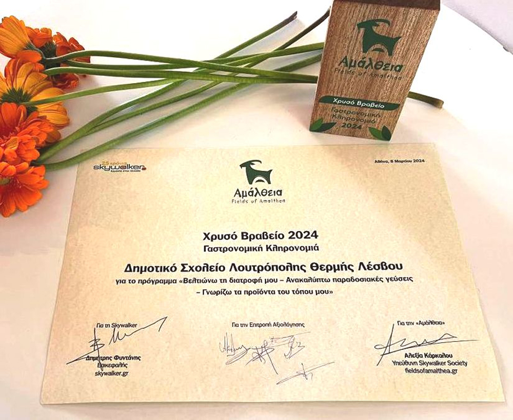 Άλλη μια διάκριση σημειώθηκε για σχολείο του νησιού μας. Πιο συγκεκριμένα το Δημοτικό Σχολείο Λουτρόπολης Θερμής κατέκτησε το Χρυσό Βραβείο για το διατροφικό του πρόγραμμα «Βελτιώνω τη διατροφή μου, Ανακαλύπτω παραδοσιακές γεύσεις, Γνωρίζω τα προϊόντα του τόπου μου», στην κατηγορία «Αναζητώντας το γαστρονομικό μας πολιτισμό», στην κατηγορία «Γαστρονομική κληρονομιά», στο Φεστιβάλ «Αμάλθεια», που έγινε στο Γκάζι της Αθήνας.