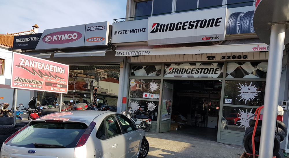 Ο κ. Μυστεγνιώτης είναι αποκλειστικός αντιπρόσωπος στην πόλη της εταιρείας elastrak, η οποία εκπροσωπεί στην Ελλάδα τον όμιλο Bridgestone, έναν από τους μεγαλύτερους κατασκευαστές ελαστικών στον κόσμο, που παράγει τα κορυφαία ελαστικά Bridgestone και Firestone. Στο κατάστημα μπορεί κανείς να βρει και την κατηγορία ελαστικών της Bridgestone DriveGuard Run-Flat Tires, ενώ παρέχεται και ένας χρόνος εγγύηση σε περίπτωση σκισίματος του ελαστικού κατά 100% ακόμη και με υπαιτιότητα του καταναλωτή.