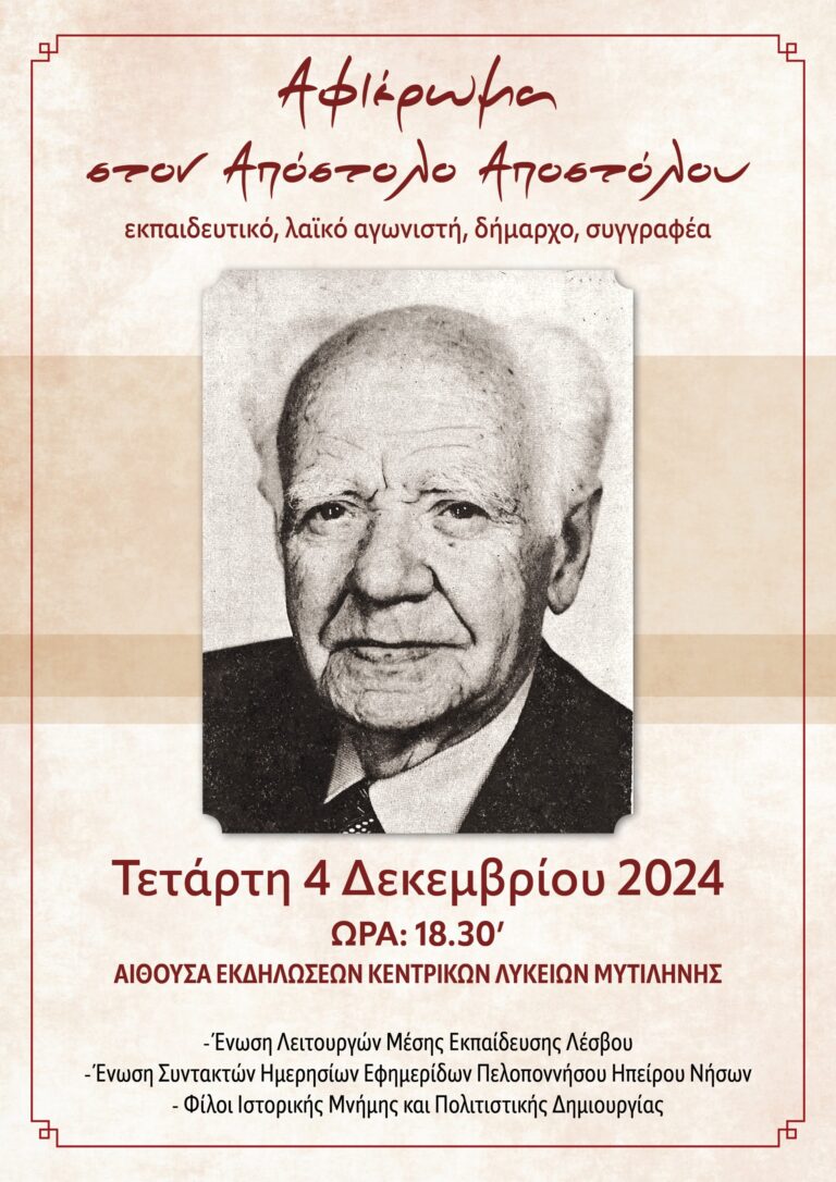 Έκθεση με ντοκουμέντα, φωτογραφίες και υλικό που αφορούν στη ζωή, το έργο, τους αγώνες και την προσφορά του αείμνηστου Απόστολου Αποστόλου θα πραγματοποιηθεί την Τετάρτη 4 Δεκεμβρίου, στις 18.30, στην αίθουσα των Κεντρικών Λυκείων Μυτιλήνης, στο πλαίσιο της εκδήλωσης-αφιέρωμα στον λαϊκό αγωνιστή, δήμαρχο, εκπαιδευτικό Απόστολο Αποστόλου, απευθύνουν οι Φίλοι Ιστορικής Μνήμης και Πολιτιστικής Δημιουργίας (ΦΙΜΠΟΔ), η Ένωση Συντακτών Ημερήσιων Εφημερίδων Πελοποννήσου Ηπείρου Νήσων (ΕΣΗΕΠΗΝ) και η Ένωση Λειτουργών Μέσης Εκπαίδευσης (ΕΛΜΕ) Λέσβου.